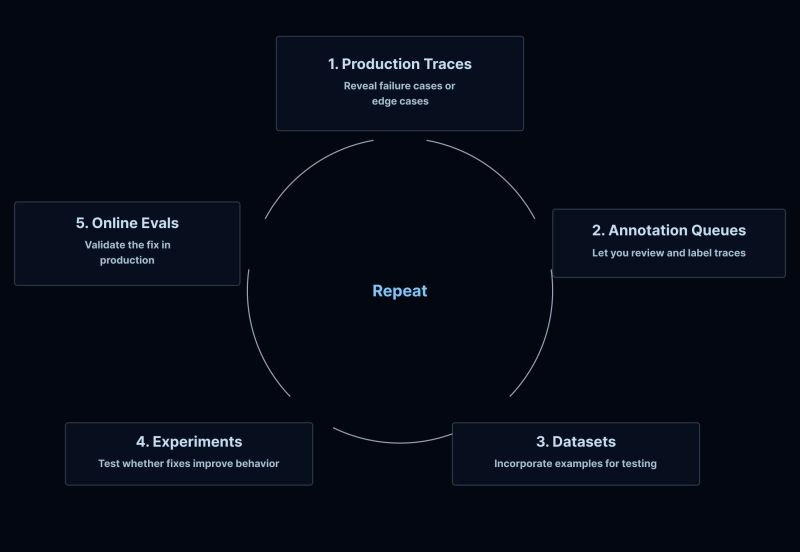 Production successes and failures should feed back into your datasets, error analysis, and eval improvements. This is the flywheel that makes your agent better over time!