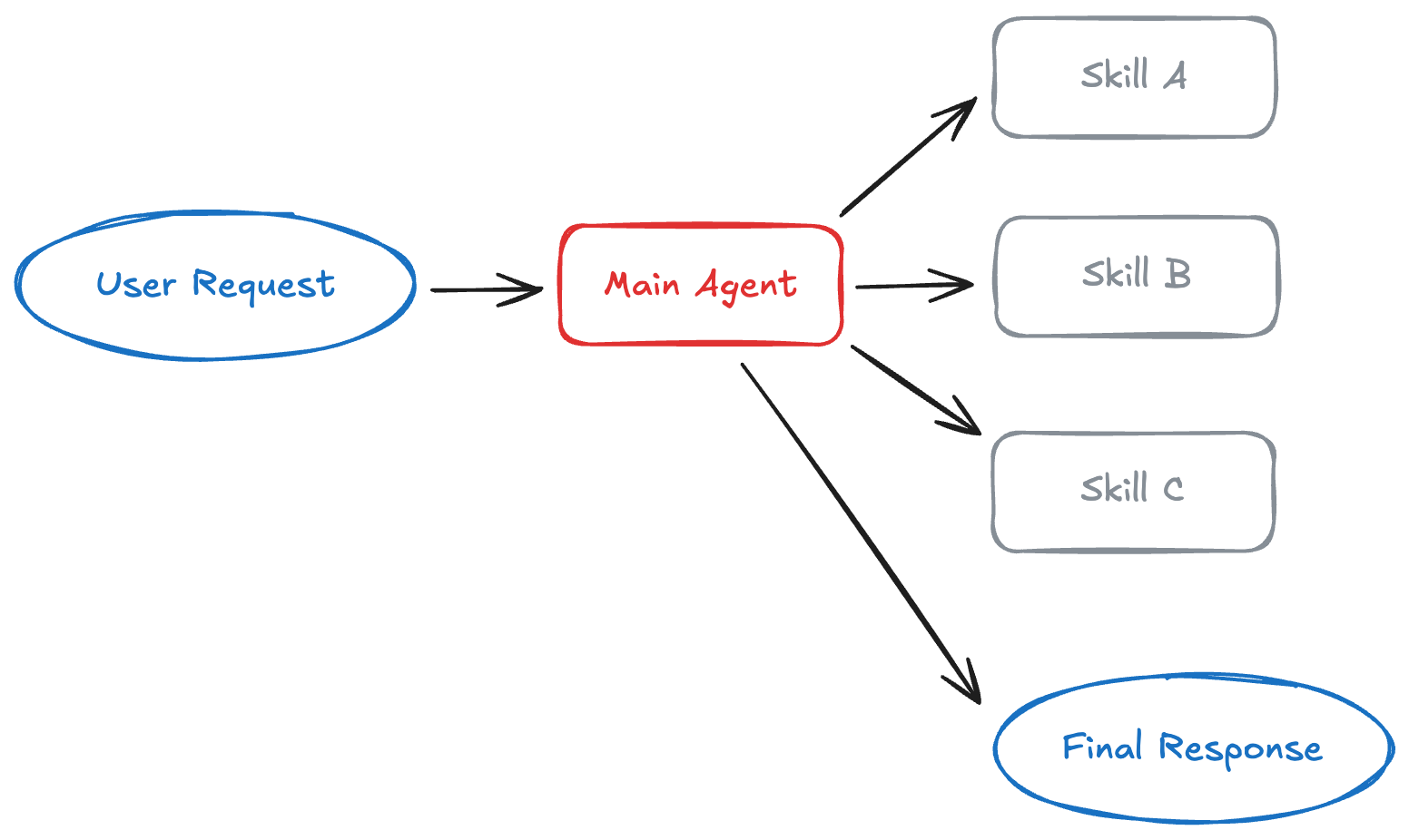 In the skills pattern, an agent loads specialized prompts and knowledge on-demand. Think of it as progressive disclosure for agent capabilities.