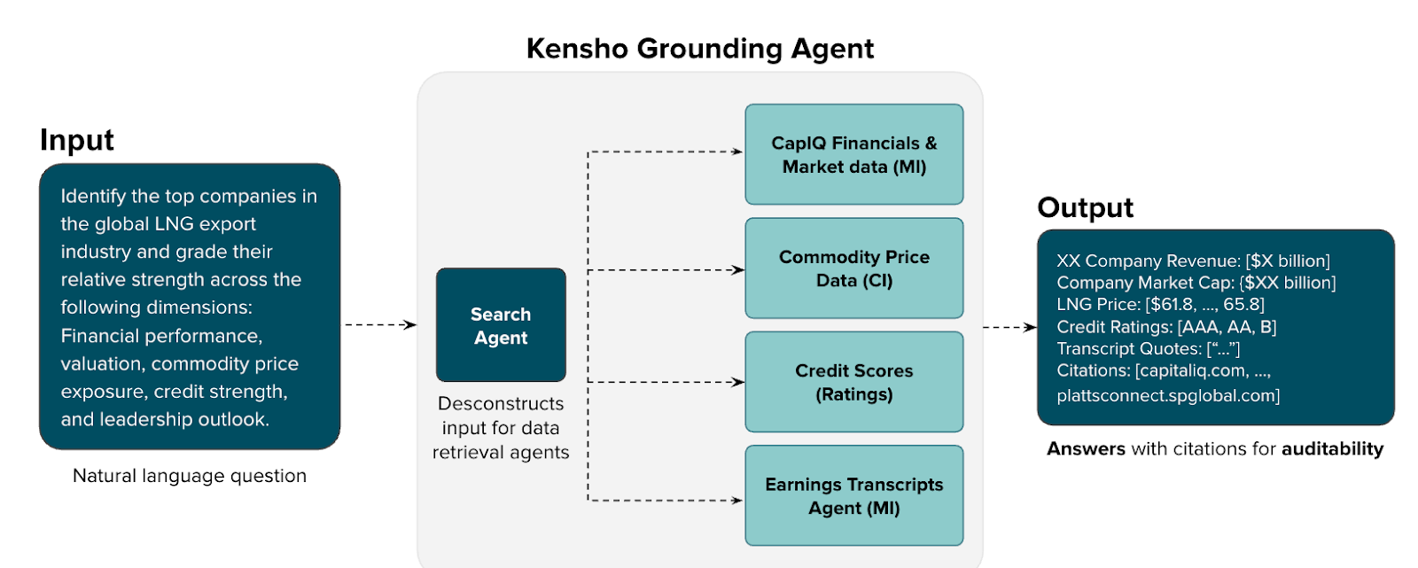 Financial professionals often struggle with data retrieval across fragmented systems, spending hours locating and verifying information that they need to analyze earnings, retrieve financial metrics, perform market research, and more. Kensho’s Grounding system simplifies this process by creating a single entry point for natural language queries against S&P Global's verified financial datasets. This eliminates the need to navigate complex database schemas or learn specialized query languages. Through Grounding, clients can access accurate real-time financial information with citation-backed responses to verified S&P Global data sources, ensuring high-trust validity and compliance with transparency and traceability in every result. This pattern enables users to focus on analysis rather than data access hunting and source validation.