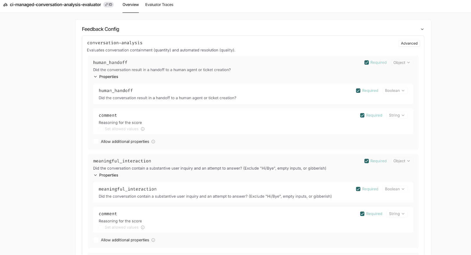 We found a perfect fit in LangSmith’s Multi-Turn Evaluator, which leverages LLM-as-a-judge to score end-to-end threads. Instead of evaluating individual runs in isolation, we can now use custom prompts to grade the entire conversation trajectory—measuring high-level outcomes like user satisfaction, tone, and goal resolution.