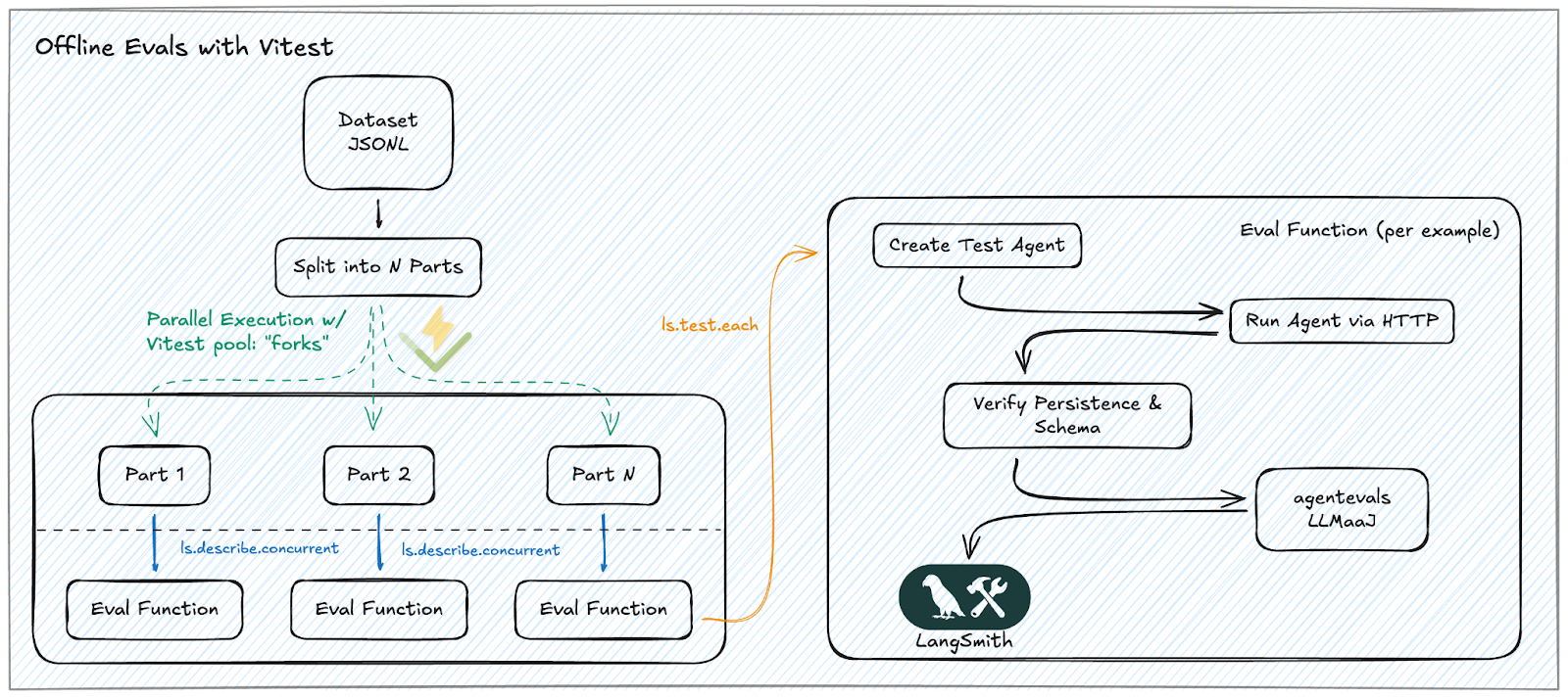 - Concurrency (I/O-Bound): Within each test file, we use ls.describe.concurrent to maximize throughput. Since LLM evaluations are high-latency, concurrency allows us to overlap the latency by firing off dozens of evaluations at once, ensuring the runner never sits idle.