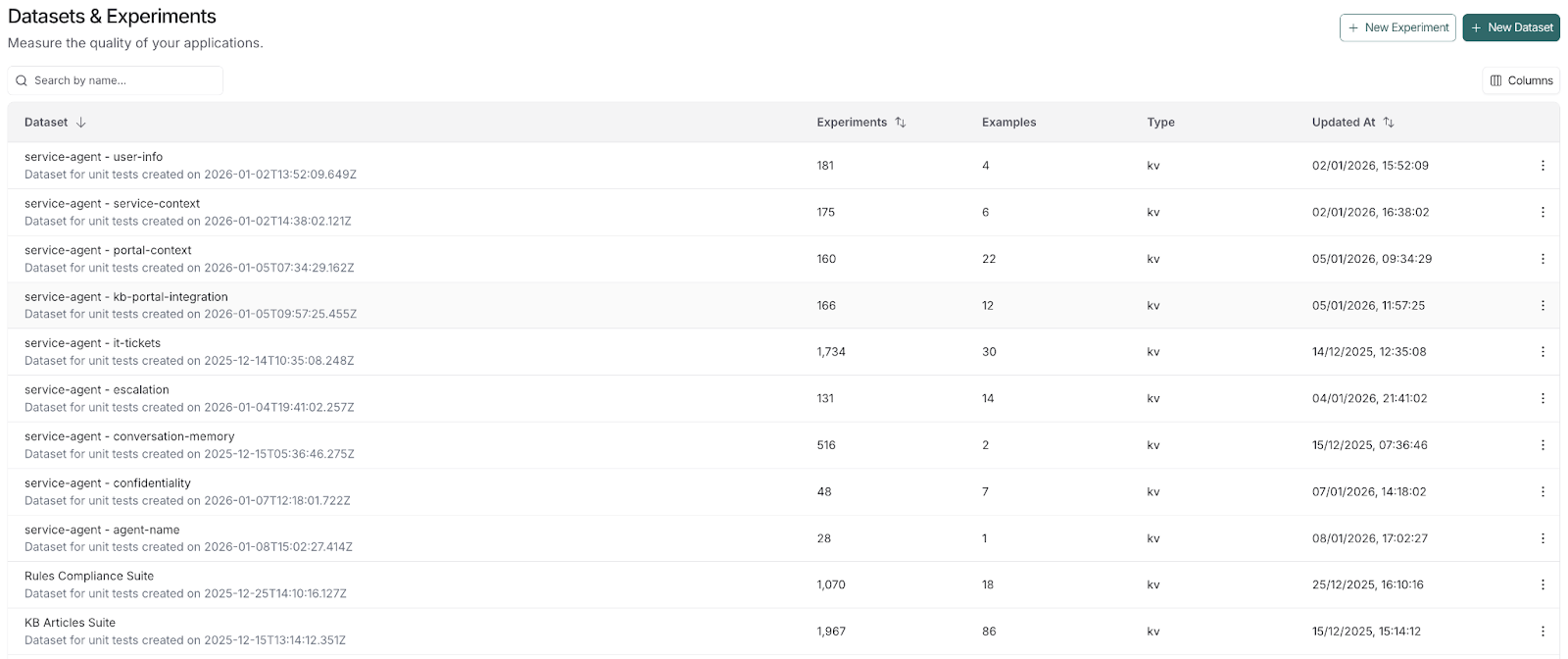 Once that baseline existed, we expanded with smaller, use-case-specific datasets to probe specific behaviors – including session memory, KB retrieval, grounding and conflict resolution, and guardrails. As these behaviors got more nuanced, we moved from one correctness score to a more comprehensive set of checks: