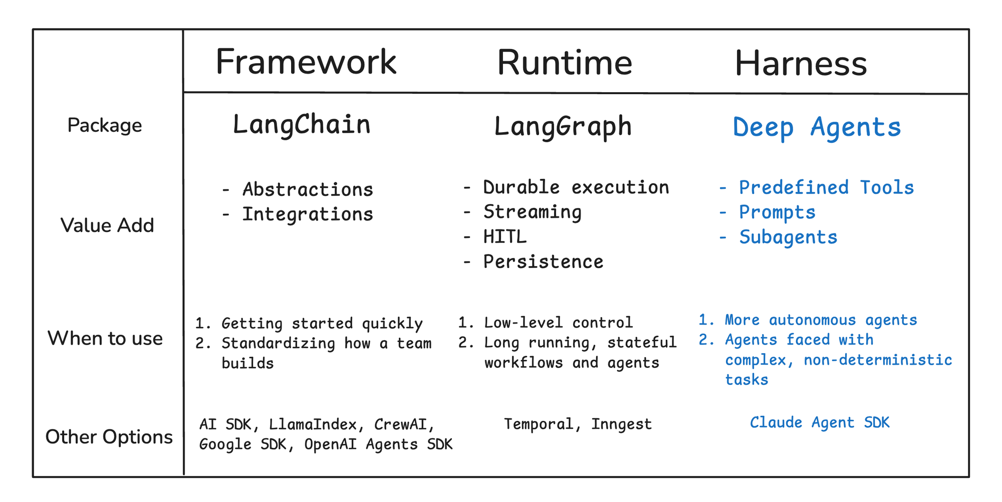This is now our third open source library we are investing in, but we believe that all three serve different purposes. In order to distinguish these purposes, we will likely refer deepagents as an "agent harness", langchain as an "agent framework", and langgraph as an agent runtime.