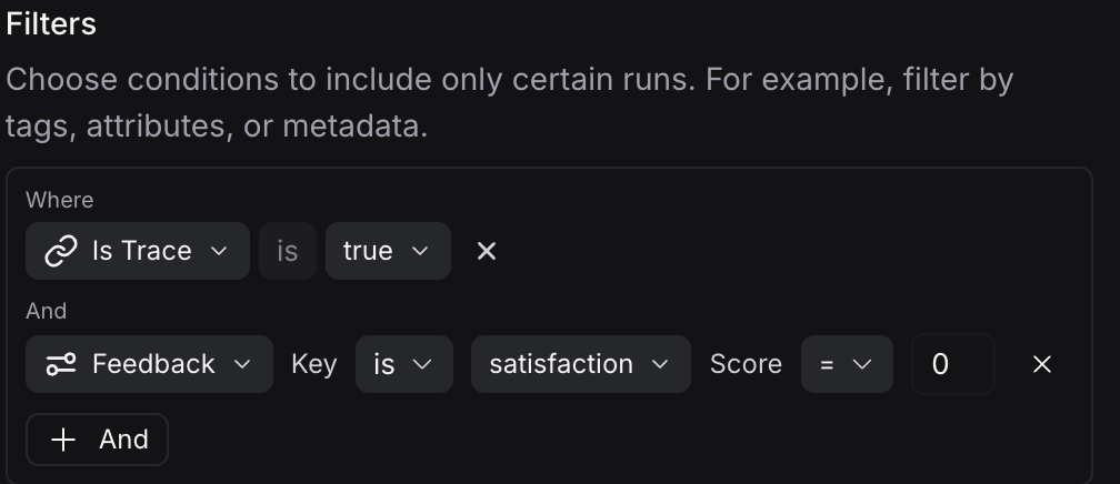 Sometimes you may only want to run Insights Agent over a specific subset of runs. This lets you combine Insights Agent with online evals or traditional product analytics. For example, you may only want to investigate runs that had negative end user feedback (e.g a thumbs down). You can do this by specifying a filtered set of runs to run Insights Agent over. Combine quantitative signals (thumbs down) with qualitative analysis (what patterns exist in those thumbs down).