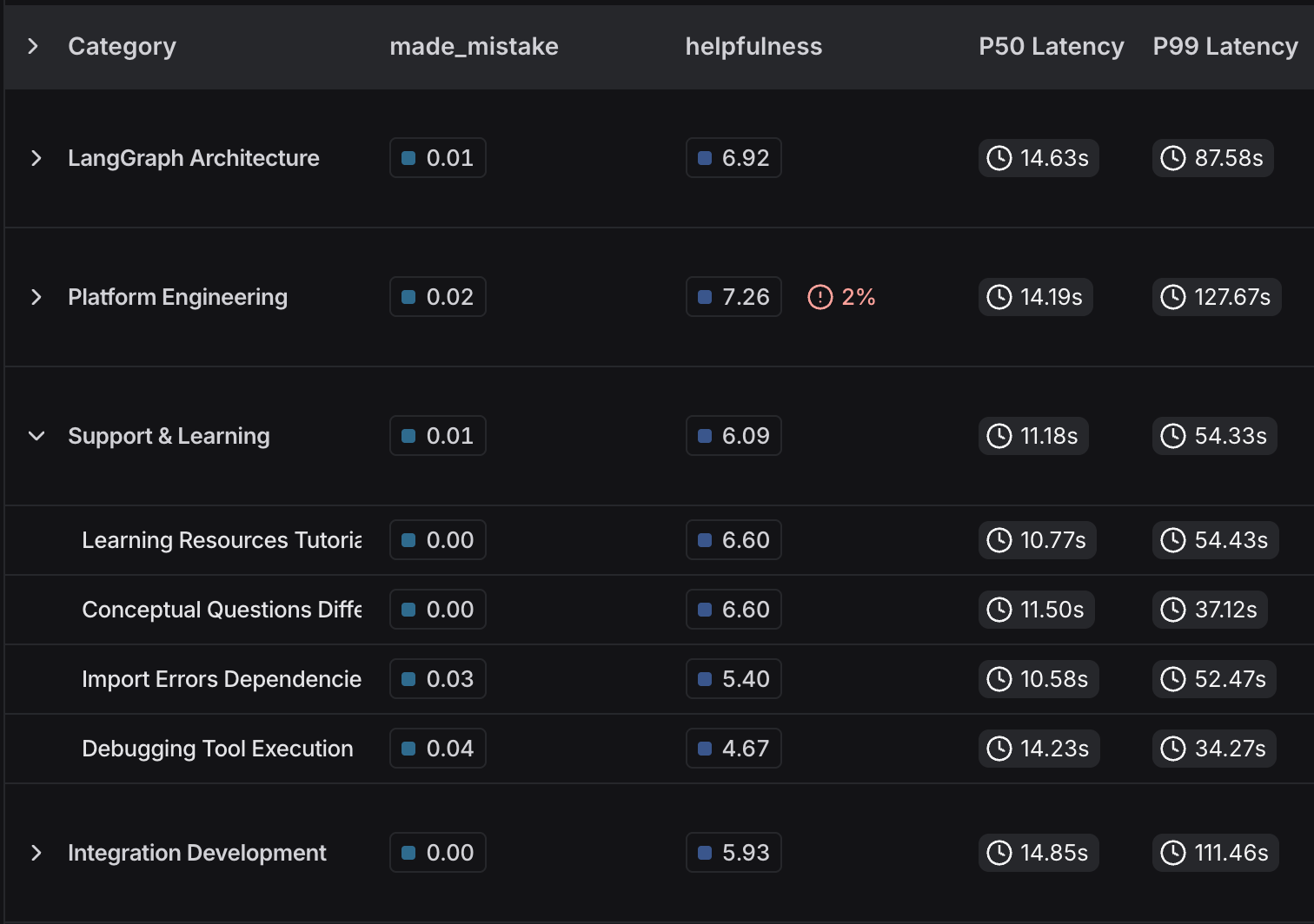 You can (and should) do this with agents as well. We’ve found that most companies in production track end user feedback, latency and tool calls.