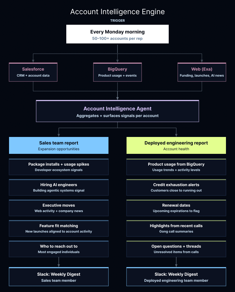 Every Monday morning, the agent pulls data from Salesforce and BigQuery. It then checks the outside world for funding rounds, product launches, and new AI initiatives. We tailored the reports for two audiences: our sales team and our deployed engineering team, since they care about different data points.