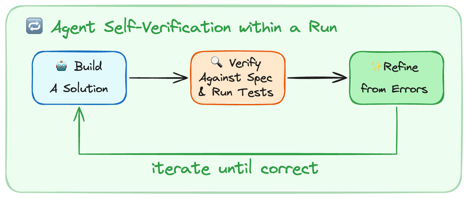Self-verification allows agents to self-improve via feedback within a run. However, they don’t have a natural tendency to enter this build-verify loop.