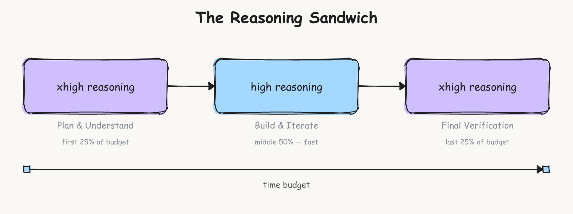 Later stage verification also benefits from more reasoning to catch mistakes and get a solution submitted. As a heuristic, we choose a xhigh-high-xhigh "reasoning sandwich" as a baseline.