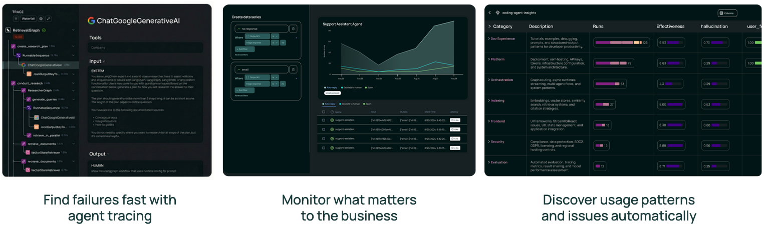 LangSmith offers deep visibility into application behavior with detailed tracing and real-time monitoring. Engineering teams can inspect and debug individual interactions, configure alerts on key metrics, and track trends over time. This observability layer helps enterprise teams maintain auditability and explainability for agent behavior.