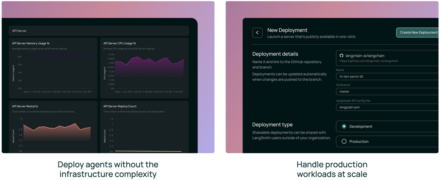 LangSmith Deployment (formerly LangGraph Platform) provides the infrastructure needed to deploy, scale, and manage stateful, long-running agents. Teams can deploy in minutes with one-click GitHub integration, expose agents via 30+ API endpoints, and choose from SaaS, hybrid, or fully self-hosted options to meet compliance requirements.