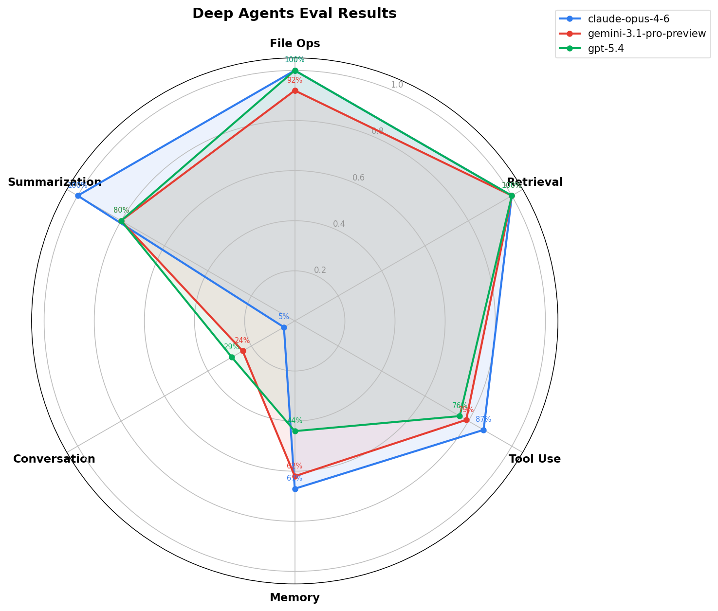 For open models, we ran seven eval categories: file operations, tool use, retrieval, conversation, memory, summarization, and “unit tests”. These cover tasks that exercise fundamentals: can the model reliably call tools, follow structured instructions, and operate on files? These are the capabilities that gate whether a model is usable in an agentic harness at all.