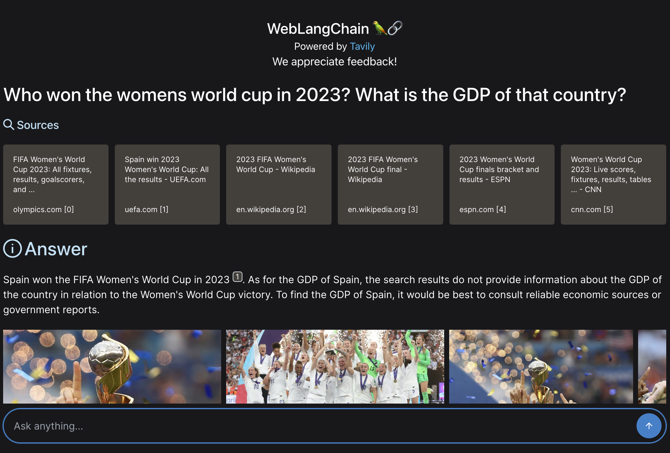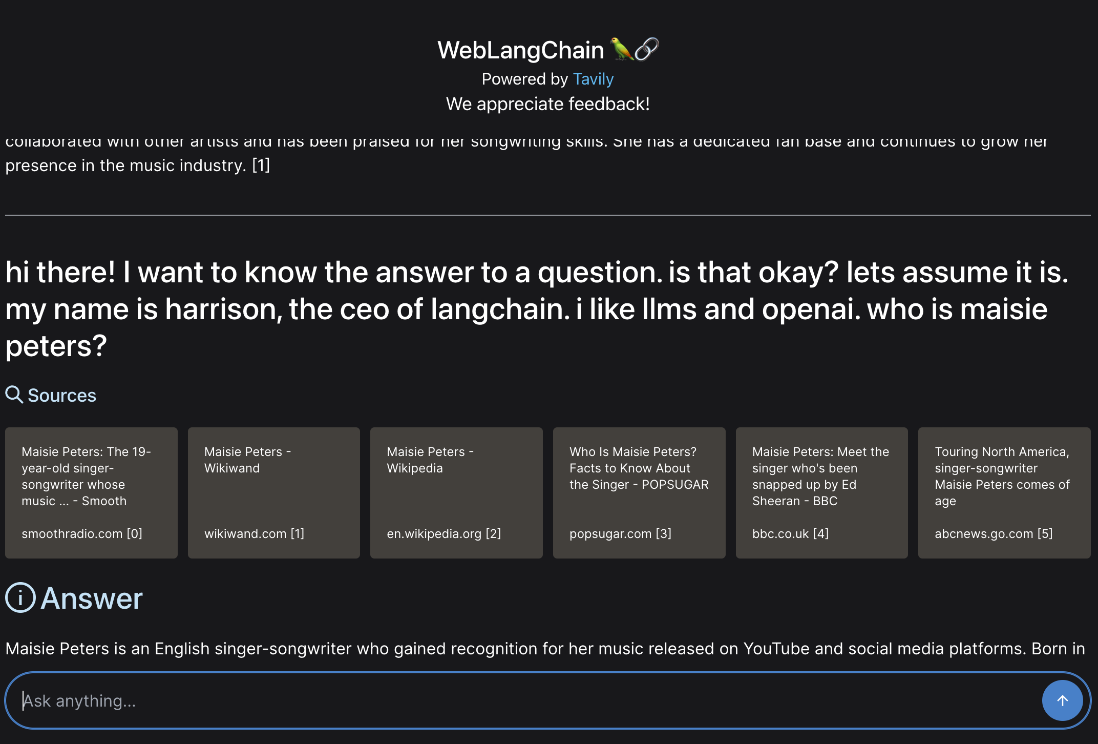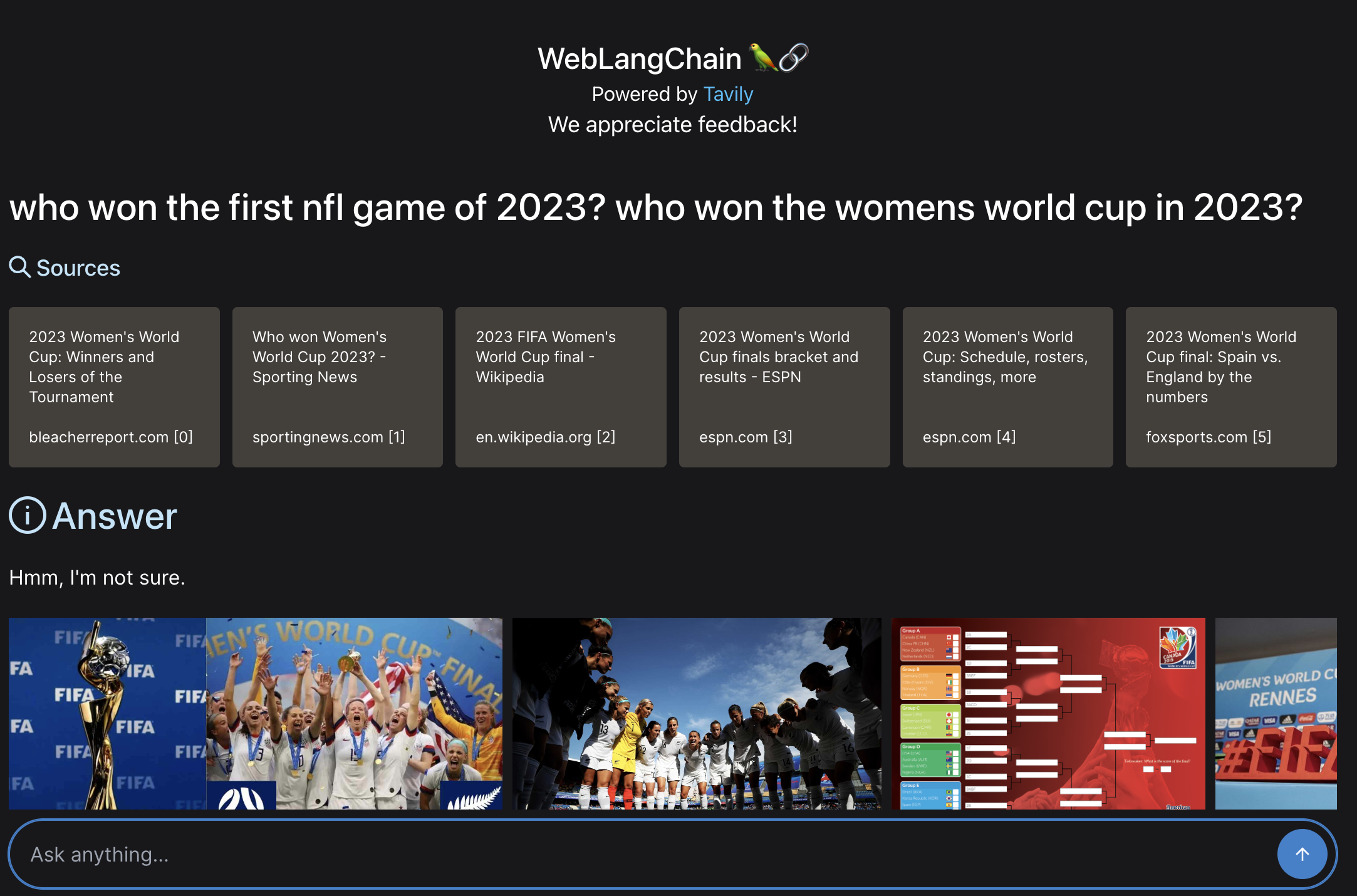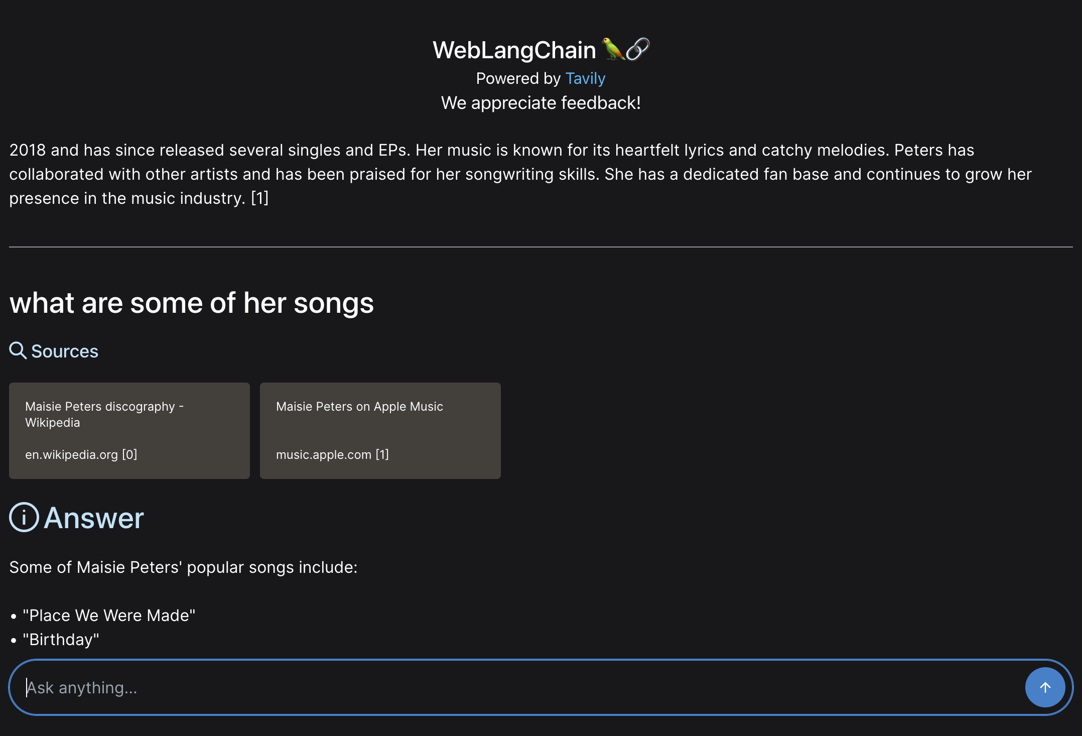 Our experience building these types of applications is that at some point you have to choose between a faster application that is a bit more limited, or a slower application that can cover a wider variety of tasks. This slower application is often much more prone to going off the rails and generally a lot harder to get right. For our web research assistant we opted for the fast chat experience. This means that does not handle multi-part questions that well: