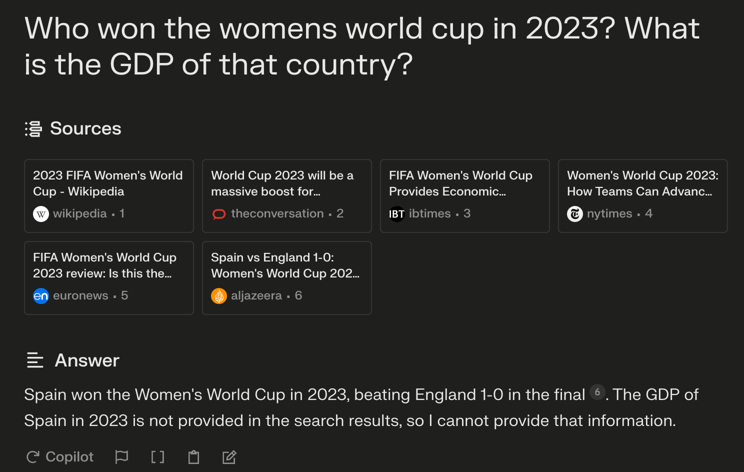 Given that Perplexity doesn't look things up multiple times, we wouldn't expect it to be able to handle this case very well. Let's try it out: