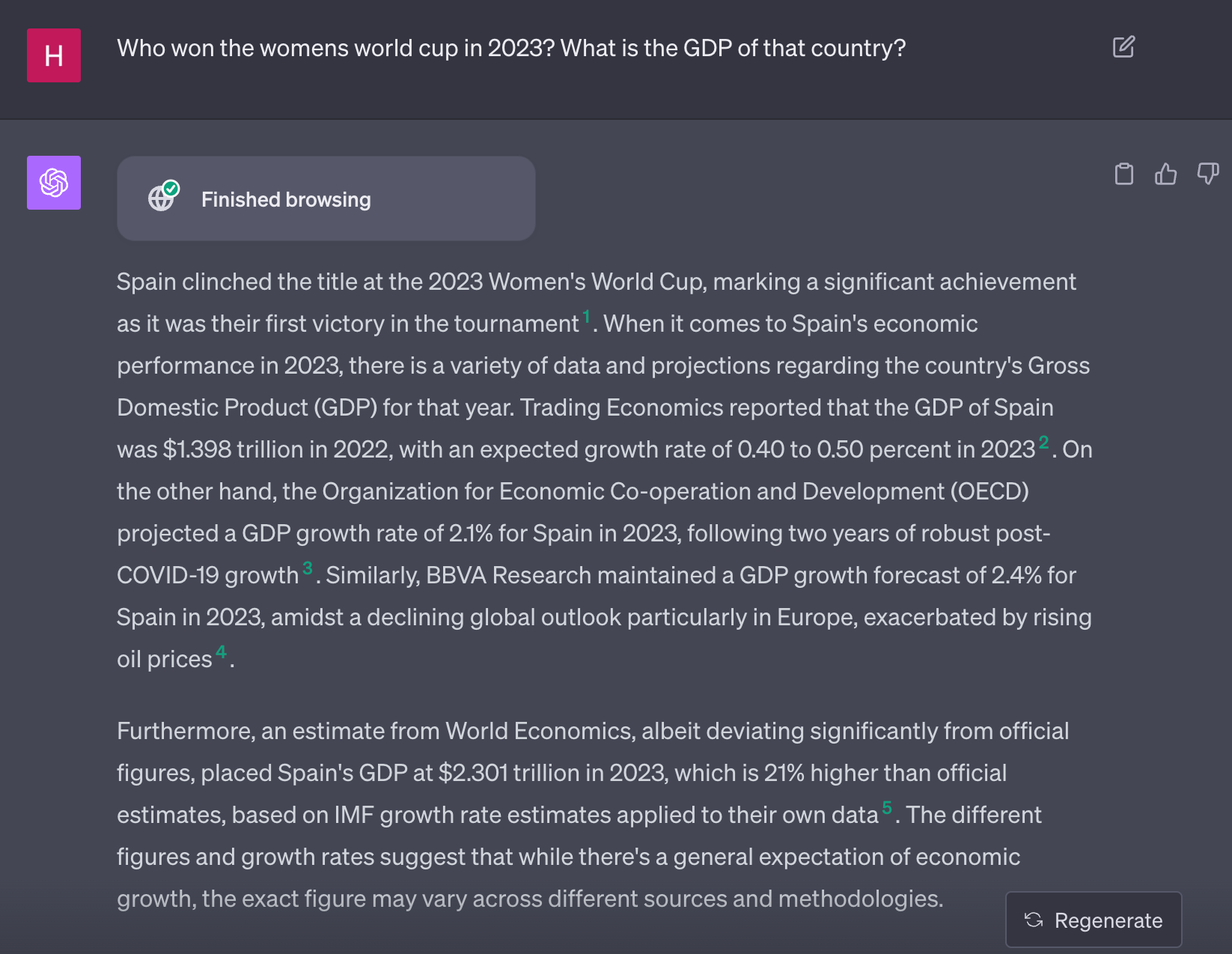 It gets the first part right (Spain did win the world cup) but since it can't look things up twice it doesn't get the second question right.