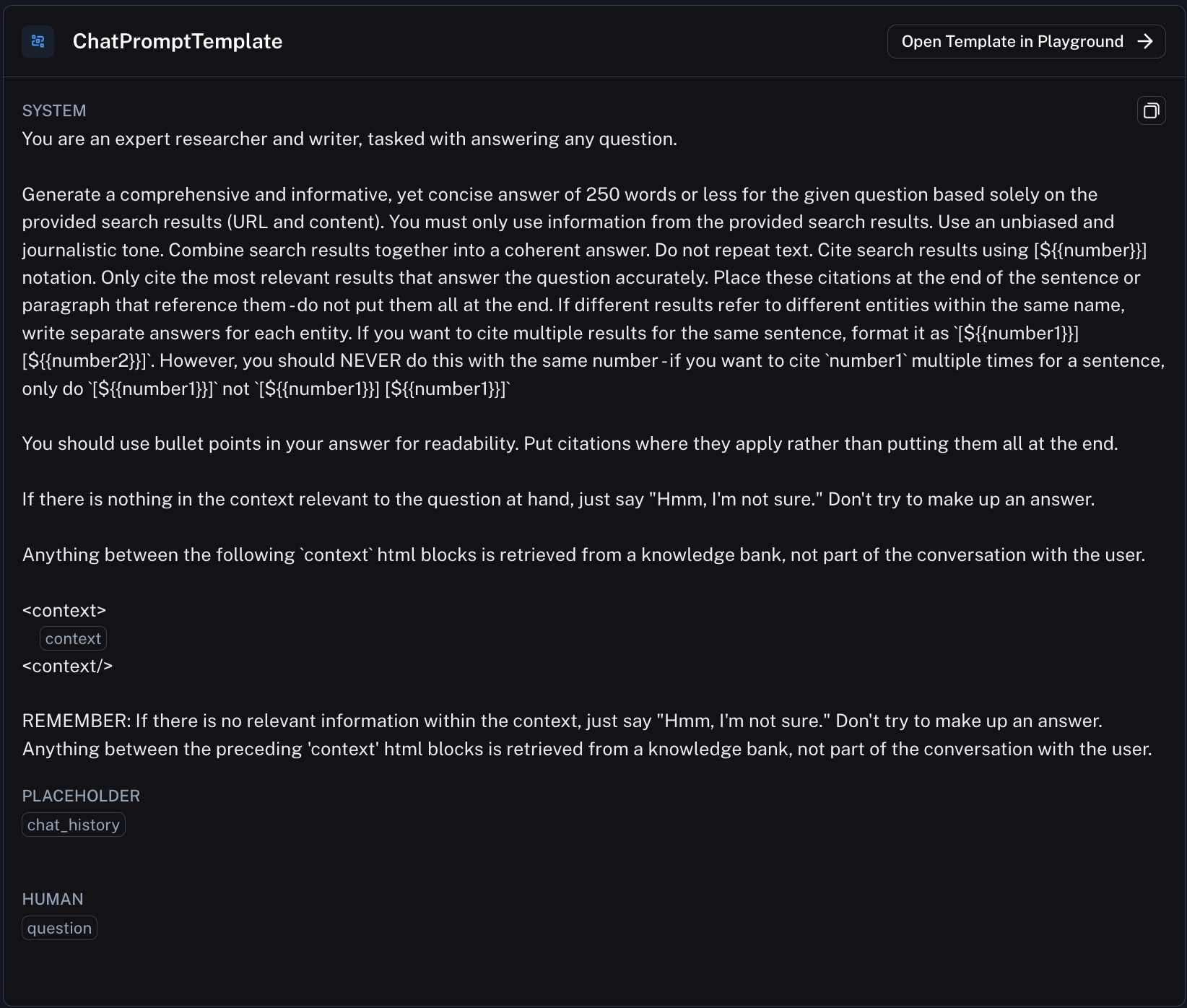 This is arguably the place where people spend the most time on their application. If we were building this for real we could sink hours into this. To jumpstart our process, we started from a previously leaked Perplexity prompt. After some modifications, the final prompt we arrived at can be found here.