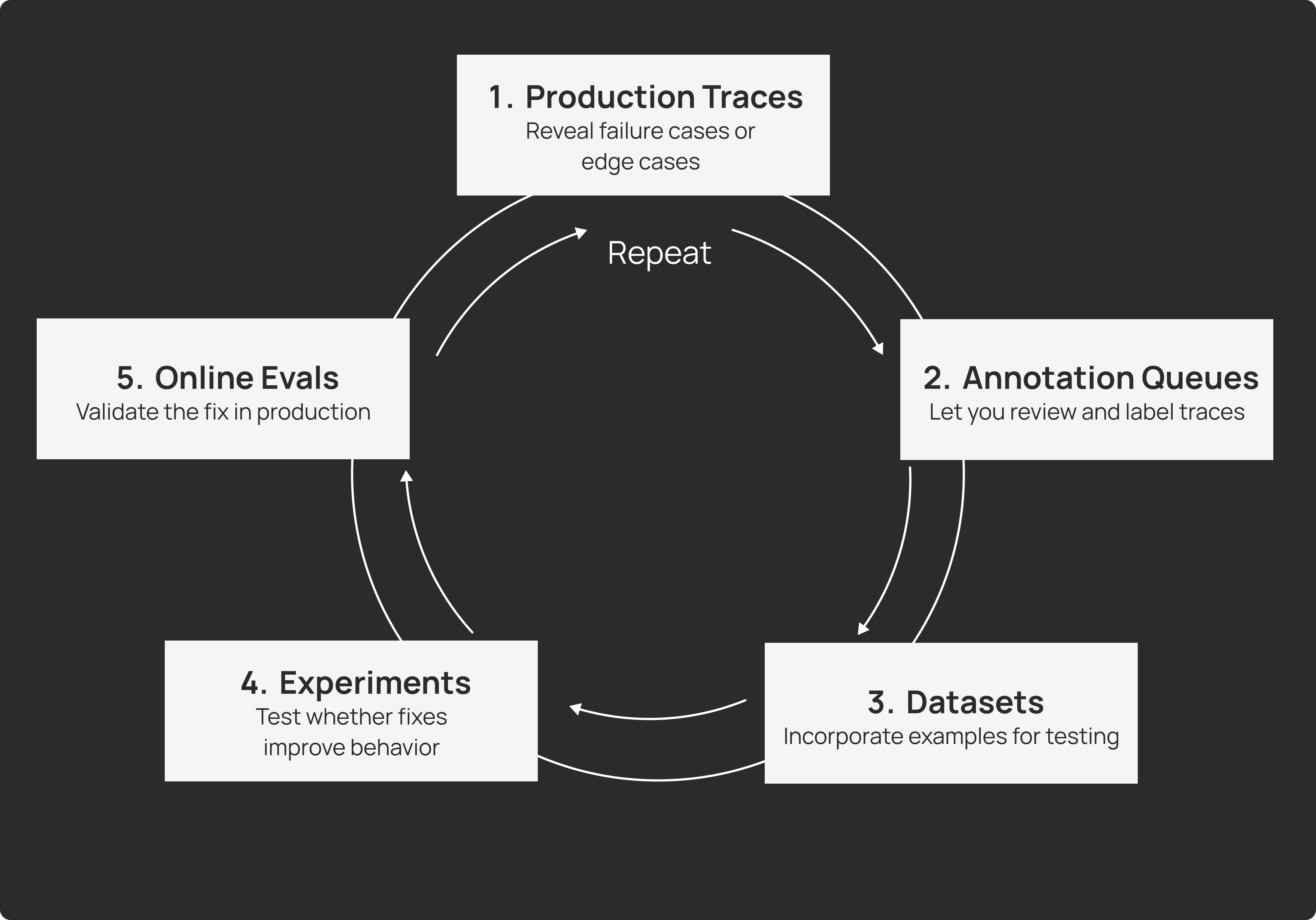 The ability to run evaluations continuously on production traffic enables a development workflow where you can drill into specific failing traces, add them to annotation queues for human review, incorporate them into evaluation datasets, and test fixes before redeploying.