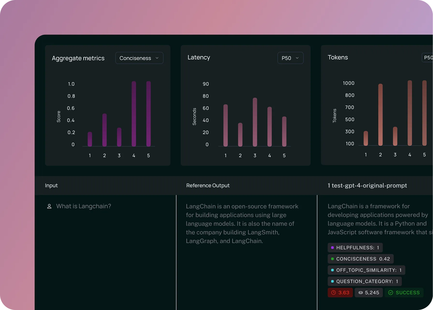 - Custom dashboards for domain-specific insights, allowing you to track success metrics (such as task completion rates or user satisfaction scores) for different workflows. You can also compare performance across model versions and monitor cost and latency by feature area