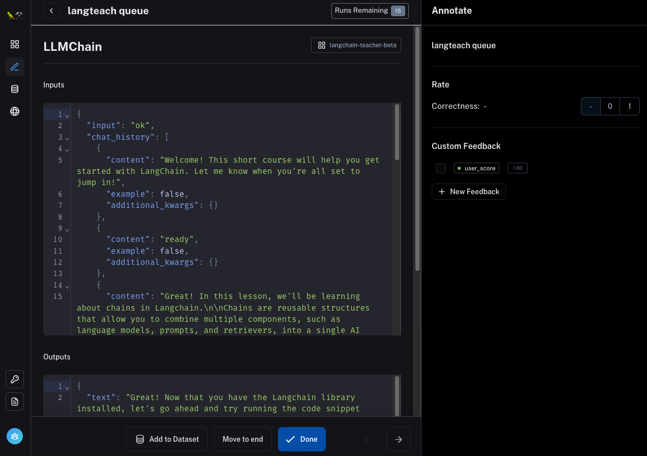 The idea of a data annotation is to create an ideal UX for reviewing logs from chains, with the purpose of either annotating them (marking them as correct or incorrect) or adding them to a dataset (for downstream usage).