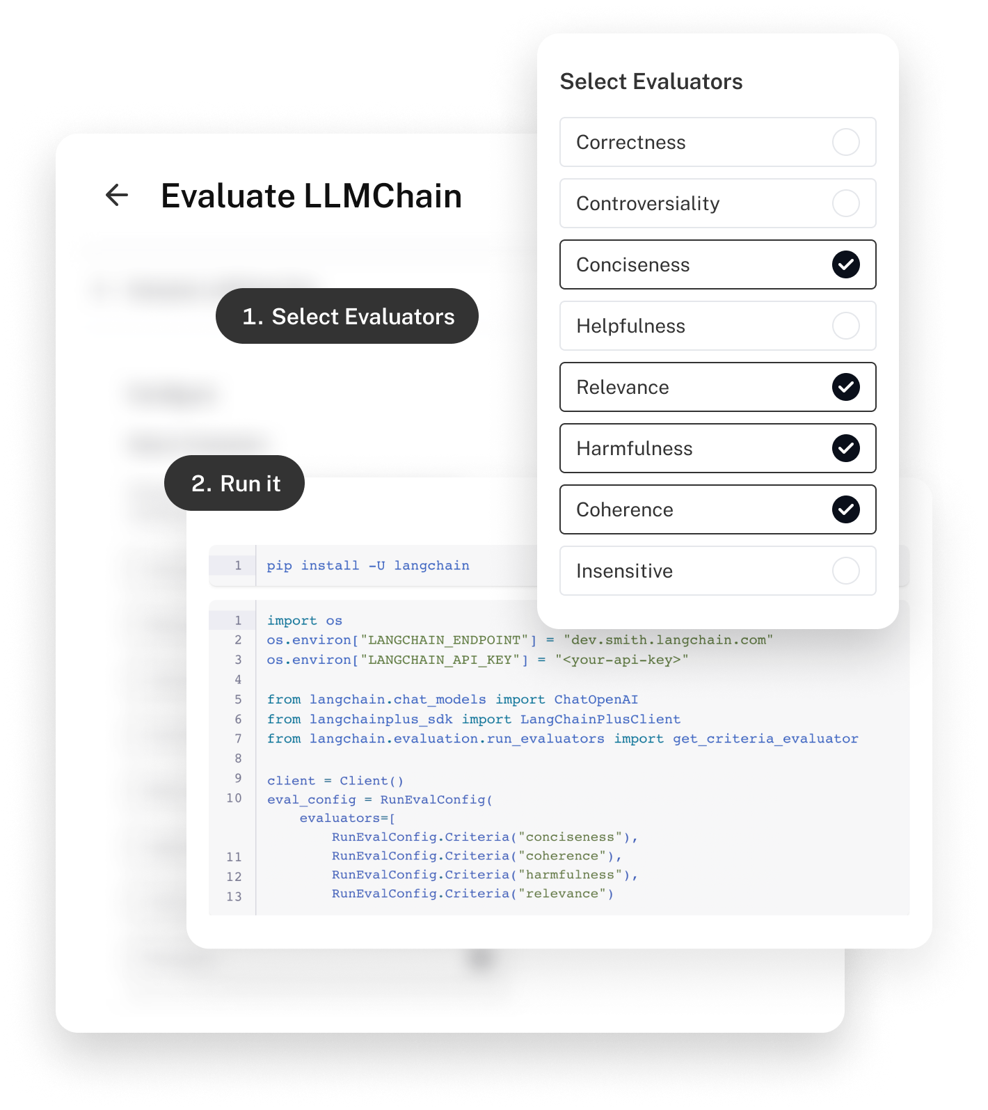 LangSmith integrates seamlessly with our open source collection of evaluation modules. These modules have two main types of evaluation: heuristics and LLMs. Heuristic Evaluations will use logic like regexes to evaluate the correctness of an answer. LLM evaluations will use LLMs to evaluate themselves.