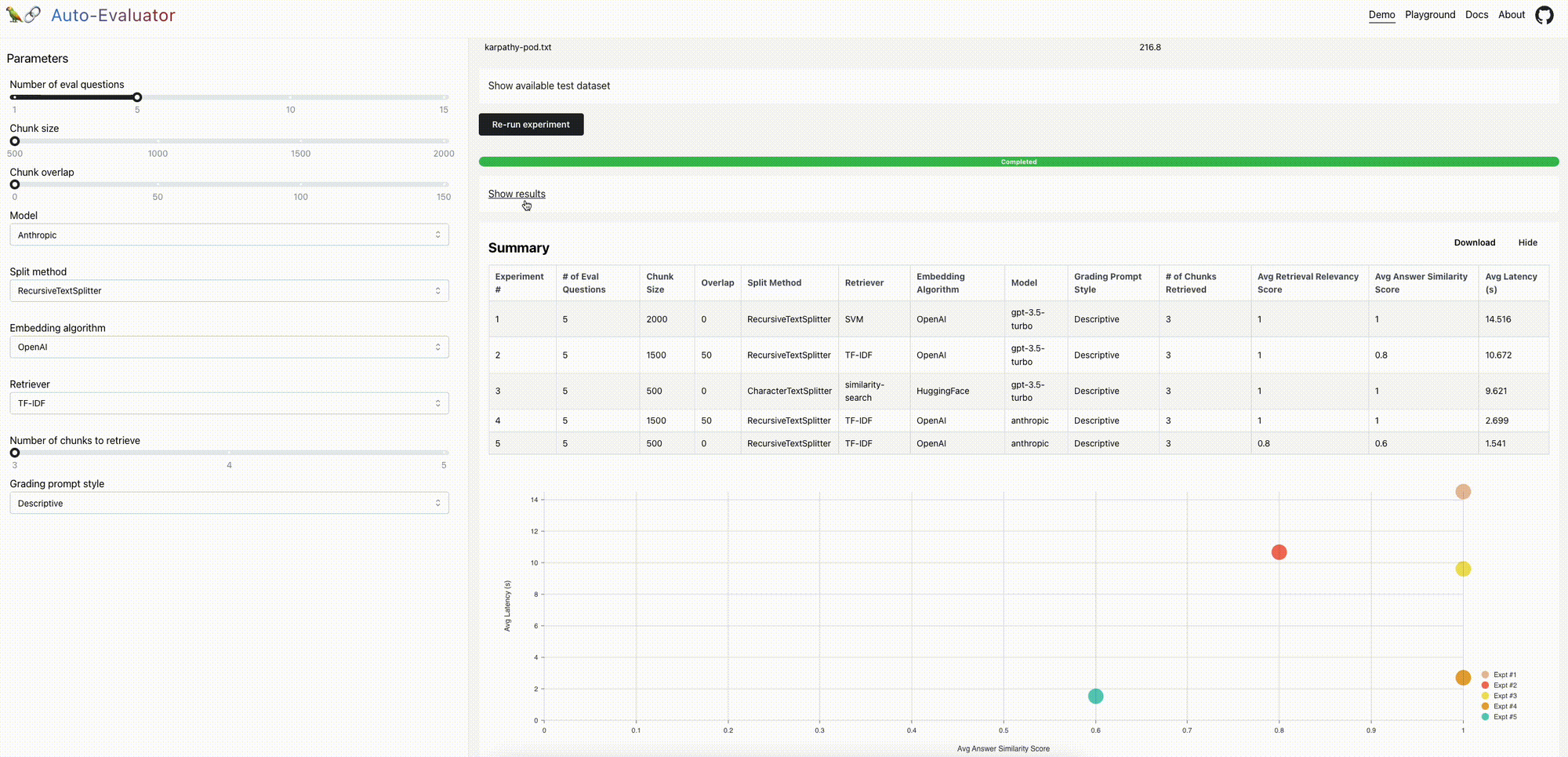 Demo: We pre-loaded a document (a transcript of the Lex Fridman podcast with Andrej Karpathy) and a set of 5 question-answer pairs from the podcast. You can configure QA chain(s) and run experiments to evaluate the relative performance.Playground: Inspired by the nat.dev playground, a user can input a document to evaluate various QA chan(s) on. Optionally, a user can include a test set of question-answer pairs related to the document; see examples here and here.