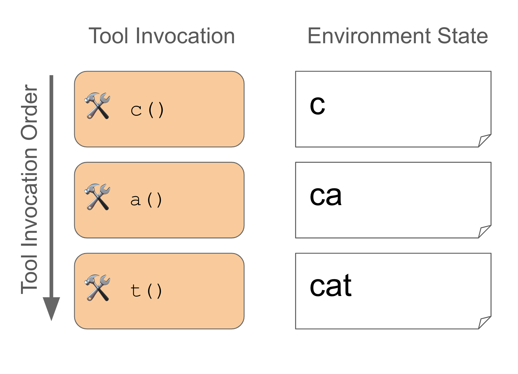 The 26-tool typewriter task tests the same thing as the single-tool use case: is the agent able to type the provided word using the provided tools (and then stop)? The difference here is that the agent must select between each of 26 tools, 1 for each letter in the English alphabet. None of the tools accept any arguments. Our cat example above would be passed by doing the following:
