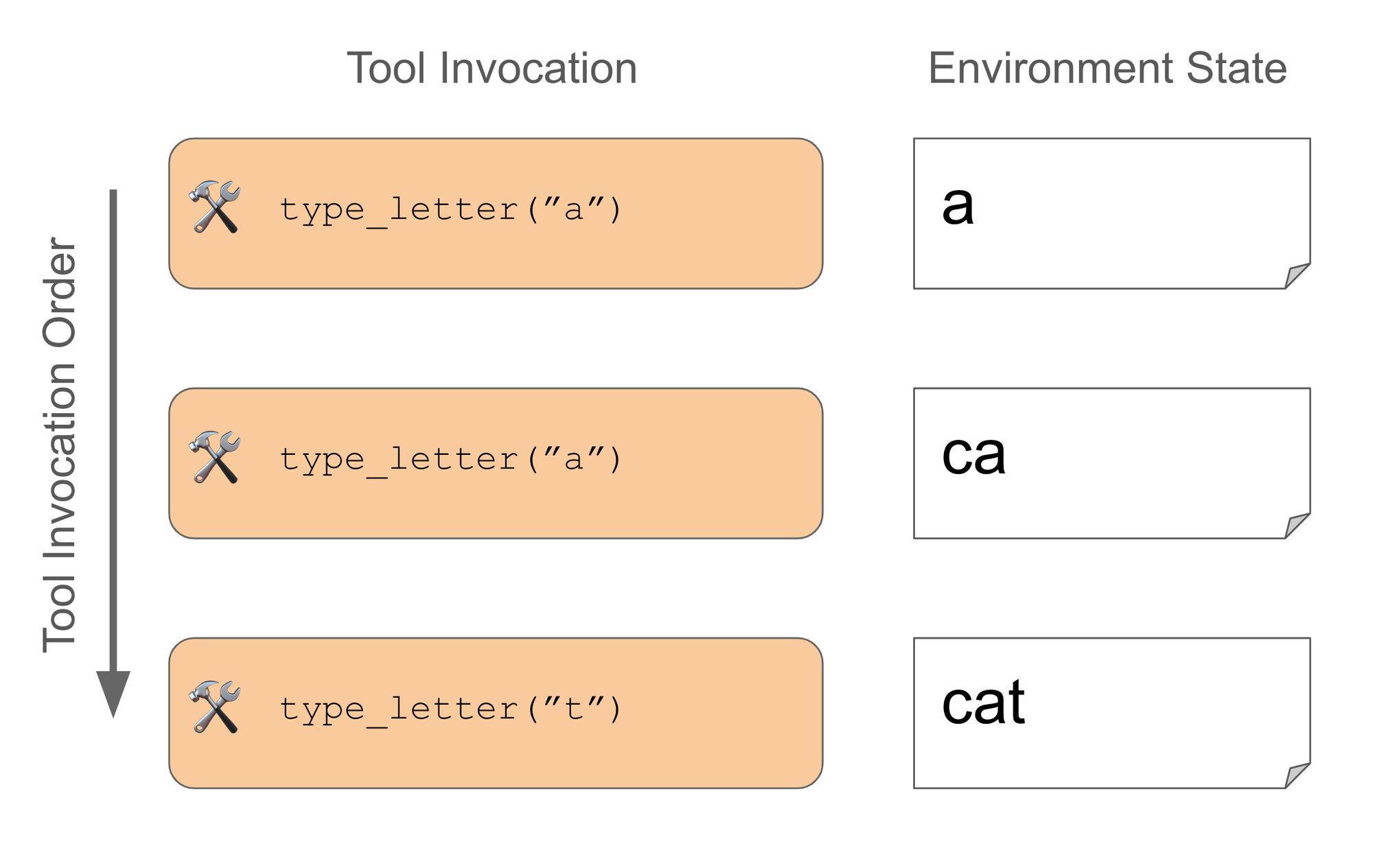 - Typewriter (Single tool): sequentially call a single tool to type out a word.