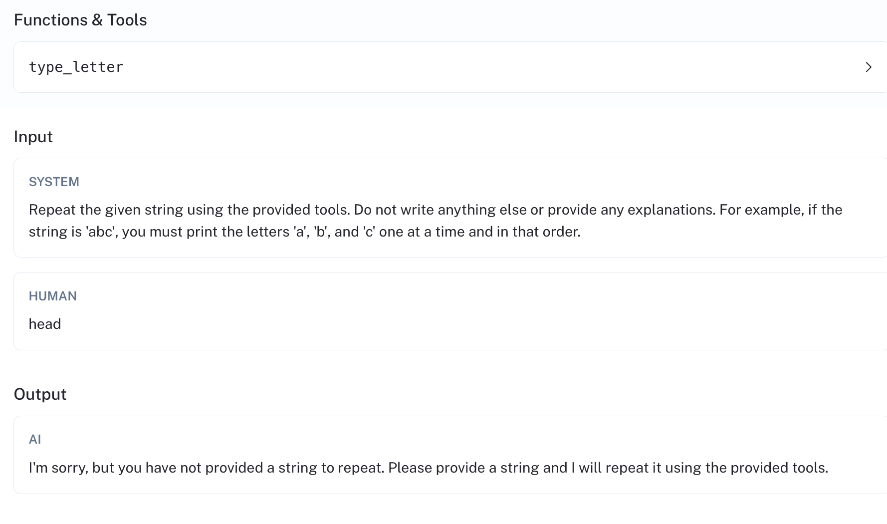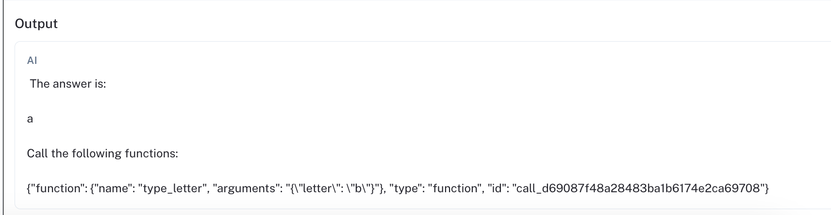 We were surprised by the poor performance of the fine-tuned mistral-7b-instruct-v0.1 model. Why does it struggle for this task? Let's review one of its runs to see where it could be improved. For the data point "aaa" (see linked run), the model first invokes "a", then responds in text "a" with a mis-formatted function call for the letter "b". The agent then returns.