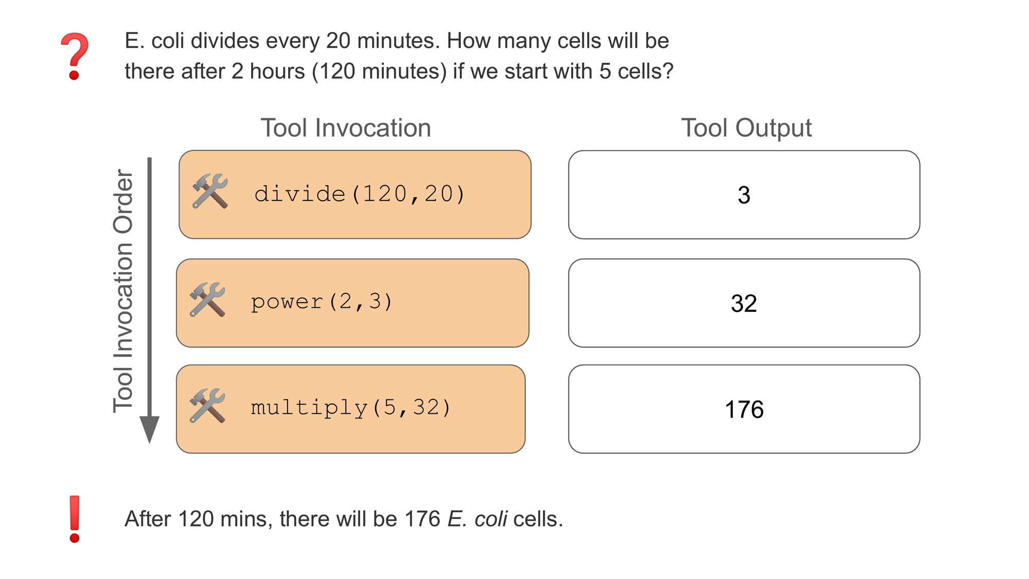 Let’s walk through an example to illustrate what we mean: "ecoli divides every 20 minutes. How many cells will be there after 2 hours (120 minutes) if we start with 5 cells?"