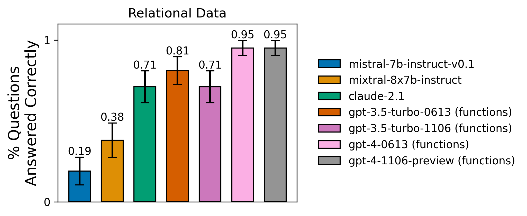 - Claude-2.1 performs within the error bounds of GPT-4 for 3 of 4 tasks, though seems to lag GPT-4 on the relational data task.