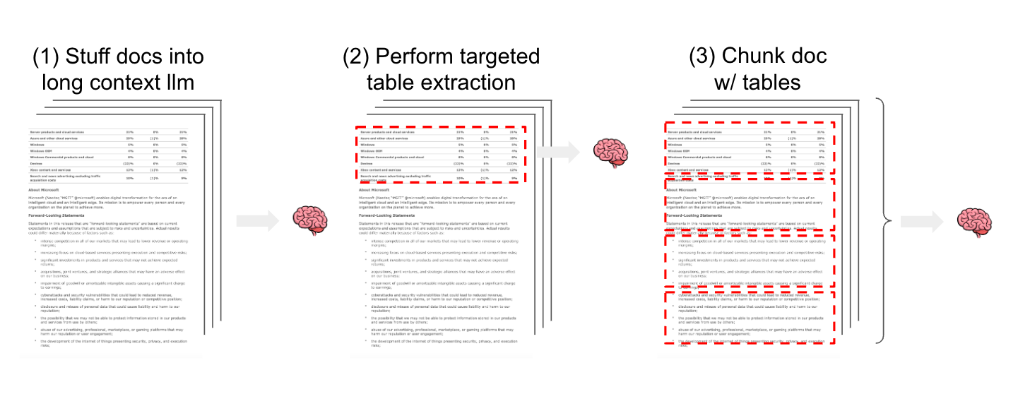 Ultimately, we found an obvious chunk strategy worked well: split documents along pages. Many document tables are designed to respect page boundaries to improve human read-ability. Of course, this approach will break down in cases where tables span page boundaries (motivating targeted extraction methods).