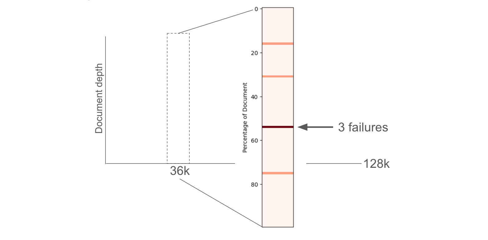 The concatenated text from all 6 documents is only ~36,000 tokens, far fewer than the 128k token context limit for GPT-4. Following the above report, we also looked at failures with respect to document depth (see results here and shown below). This would would benefit from more careful examination to better understand why and when long context LLMs fail to recover information in tables.
