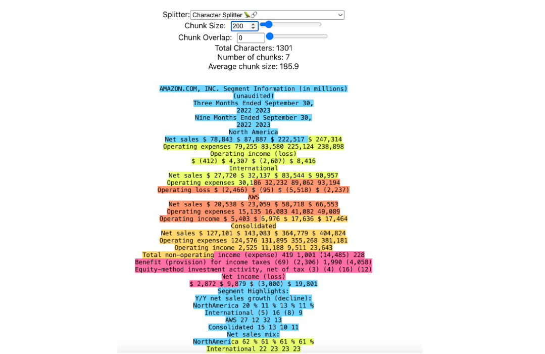 While targeting table extraction focuses specifically on finding and extracting tables, document chunking naively splits documents based upon a specified token limit. The challenge here is straightforward: if we chunk a document in a way that disrupts table structure, then we will not be able to answer questions about it. As an example, we saw lowest performance with 50 token chunk size (30% accuracy) and we can visualize this using chunkviz from Greg Kamradt: this obviously breaks up one of our examples tables in a problematic way and degrades performance.
