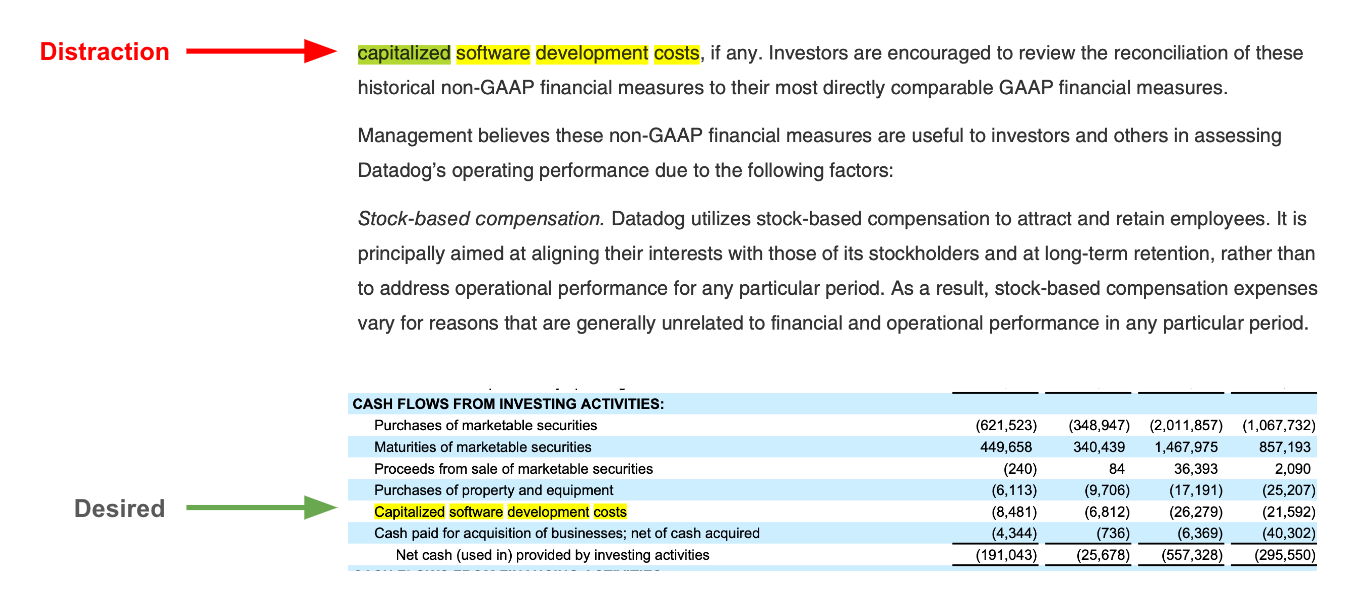 However, we found another problem: chunks from tables, which contain our most valuable information, can compete with chunks from the text body of documents. Here is a trace that highlights the problem: we want the capitalized software expense for Datadog in one of our docs but fail to retrieve the table chunks because this keyword is present in much of the text body, acting as a distraction.