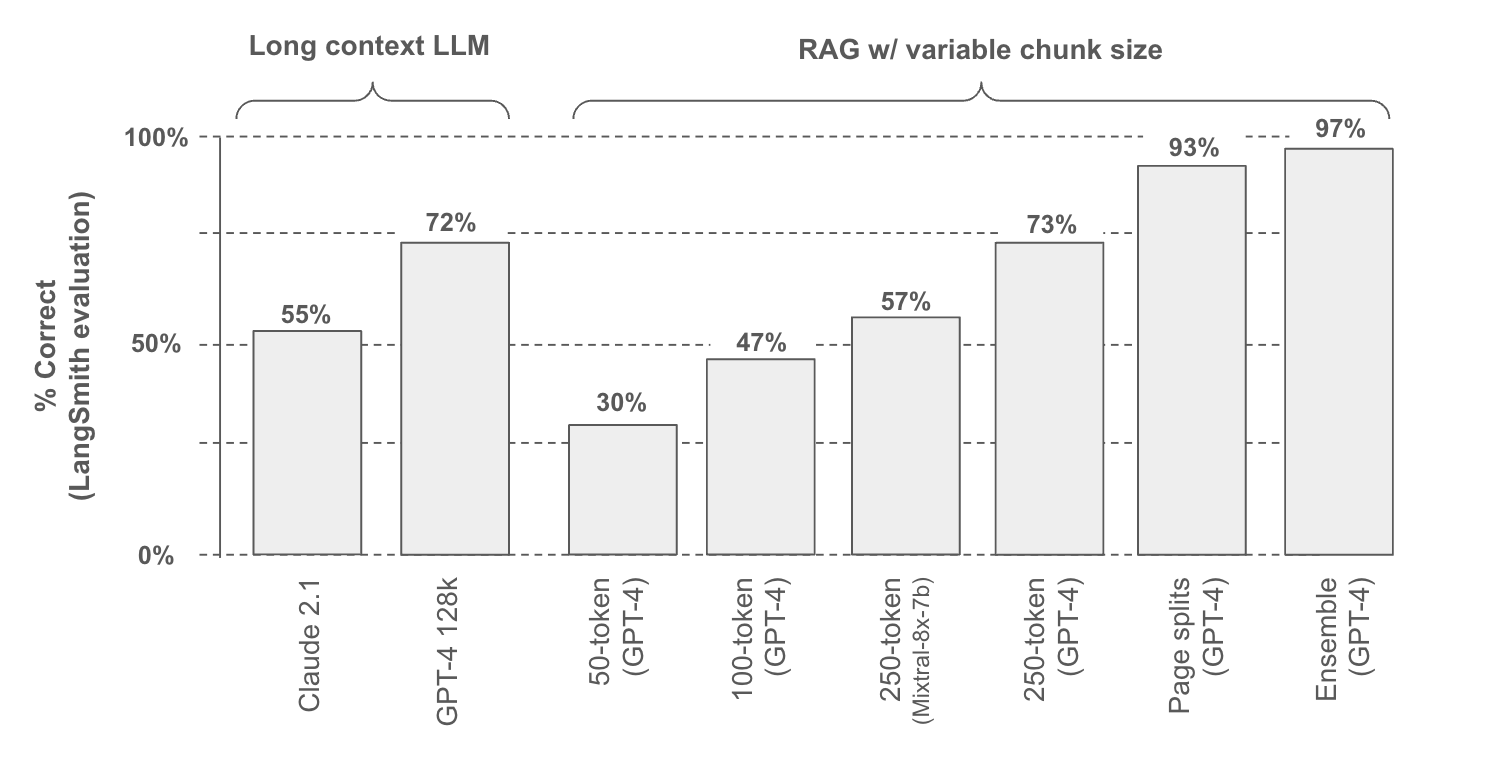 We tested two different long context LLMs along with various approaches for chunking documents. We use LangSmith to grade the responses relative to the ground truth answer presented in the benchmark (chart below, runs here).