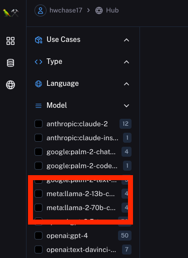 First, let's go the LangSmith Hub. We can filter existing prompts in the hub to ones that are meant for Llama-2. Note: this is a manual tagging, so it could be incorrect, but it's a good start.