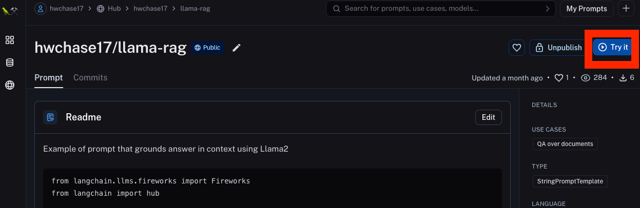 Let's choose the hwchase17/llama-rag prompt. Once on this page, we can click on "Try it" to open it in the playground.