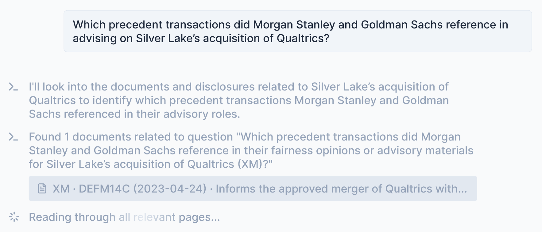 One of the most powerful aspects of this design is the visibility it offers. In Captide’s implementation, users don’t just see the final answer–they see the entire thought process. As the agent works through a request, the interface streams updates on the steps it’s taking, which sources it’s checking, and what it’s finding along the way. This matters because no two queries follow the same path—researching an M&A deal is very different from benchmarking companies, and Captide’s clients expect transparency into every step. For example, if someone asks about a past acquisition, the system recognizes the task, pulls relevant documents from a massive library of filings and disclosures, and surfaces key excerpts. All of this is shown to the user in real time, making the research traceable and auditable from start to finish.