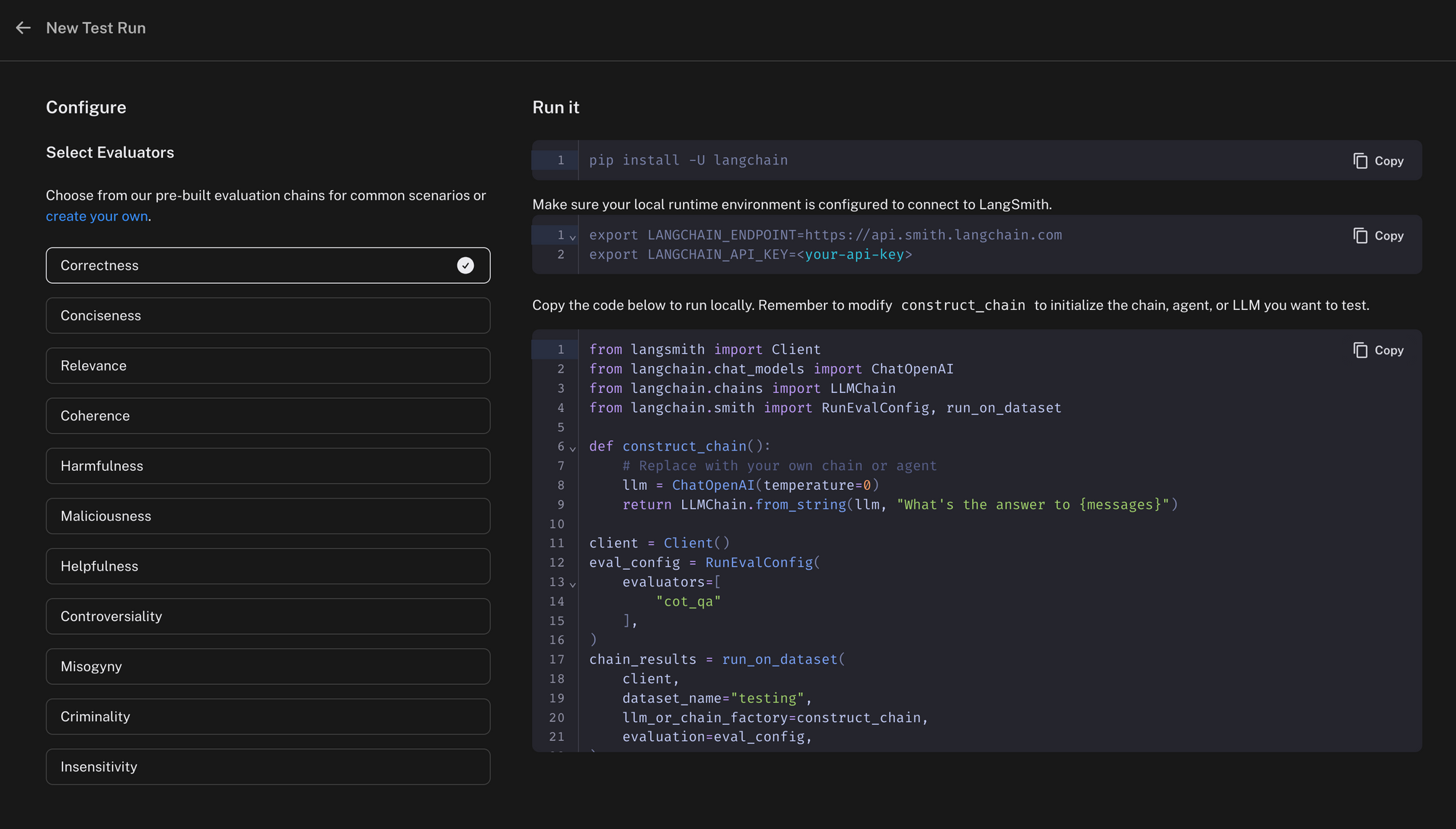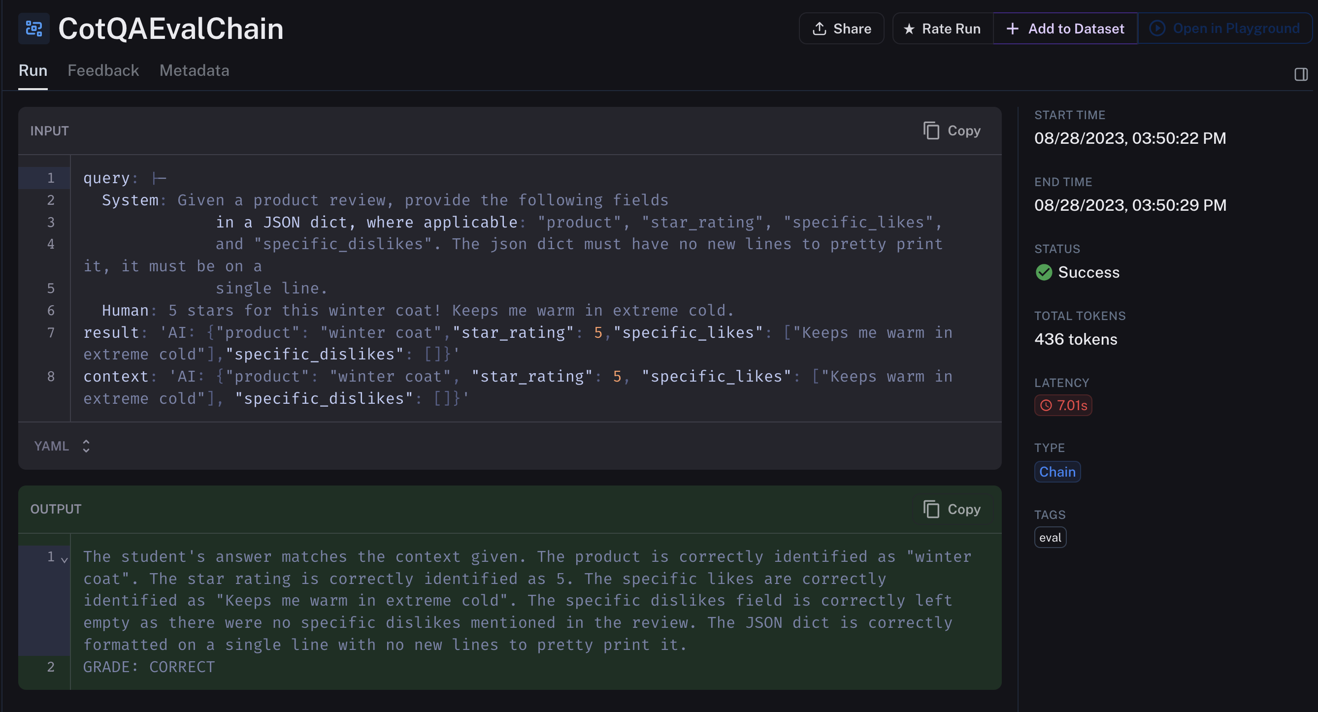 Before we unveil each model’s performance, let’s get familiar with our evaluation process. LangSmith provides ready-to-use evaluators, but you’re free to build your own. In our case, we’re leveraging gpt-4 to assess the outputs from various models, using a chain-of-thought Q&A prompt. If the model’s answer doesn’t match the expected response, it’s labeled INCORRECT. Just like DataDog, you run the code on your end and send the results to LangSmith for logging and comparison.
