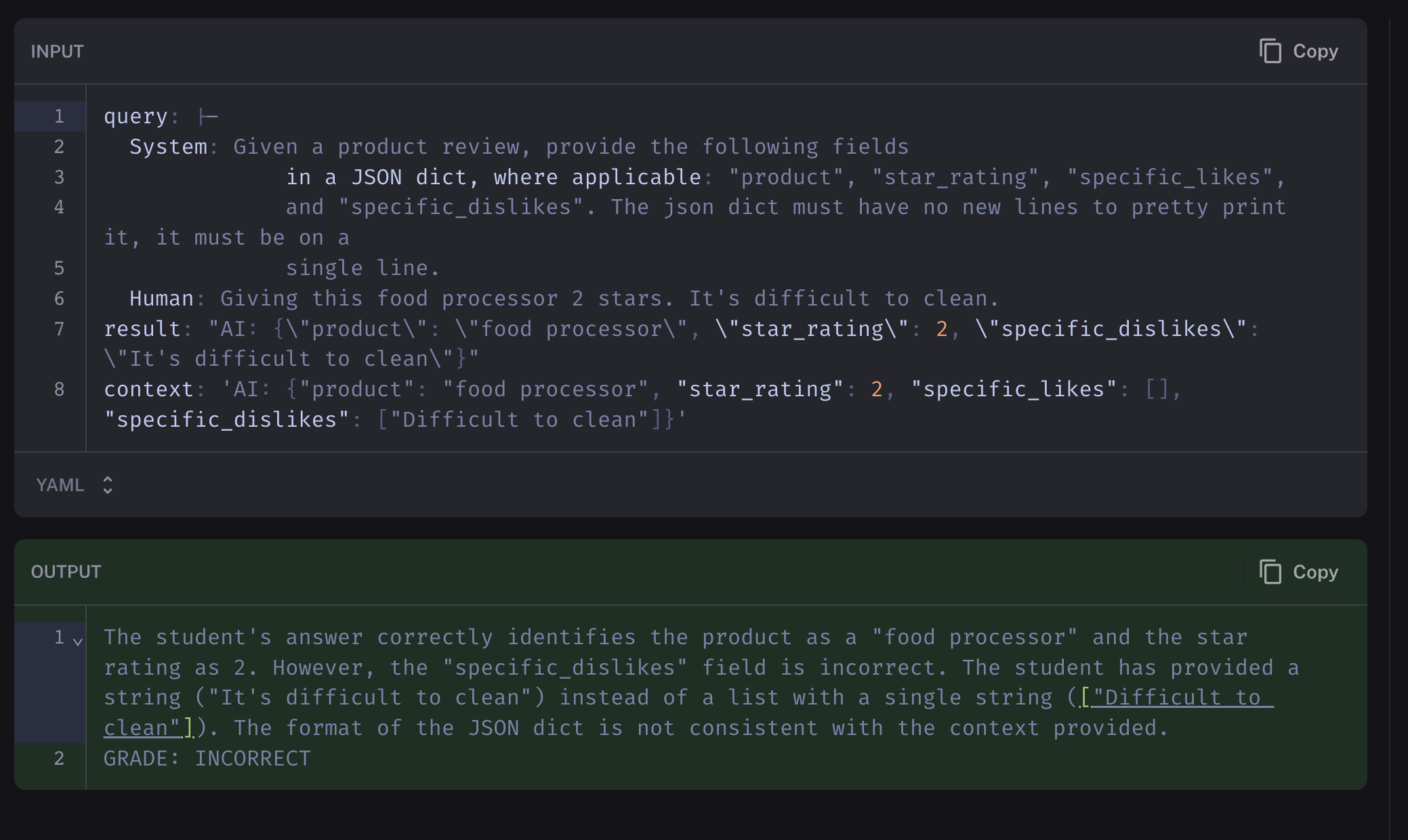 Here’s an example of output from gpt-3.5-turbo-finetunedbeing evaluated. gpt-4 uses the provided context in the input as an example of “correct”. You can see how based on that context, the fine tuned model outputted successfully.