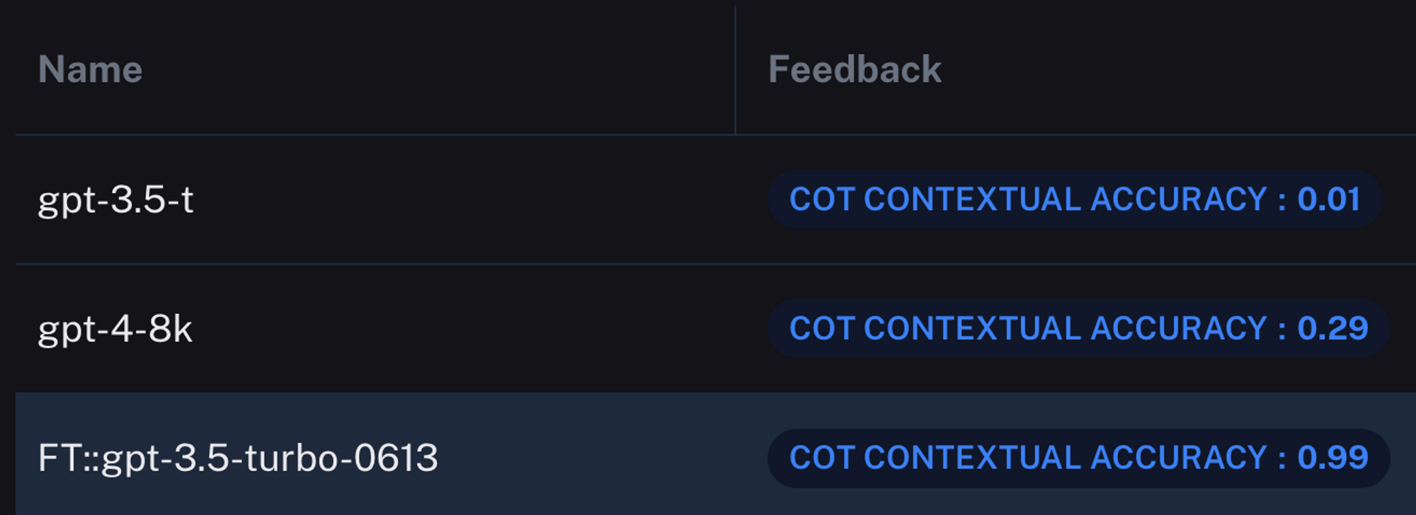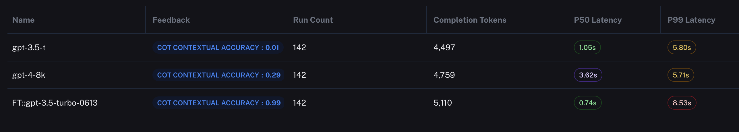 However, it’s really the accuracy where things get interesting. LangSmith measures the output accuracy of gpt-3.5-turbo-finetuned at 99 percent correct. It got only 1 incorrect. Let’s take a look at the other models.