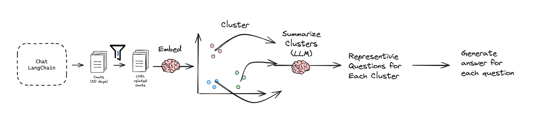 To demonstrate code generation on a narrow corpus of documentation, we chose a sub-set of LangChain docs focused on LangChain Expression Language (LCEL), which is both bounded (~60k token) and a topic of high interest. We mined 30 days of chat-langchain for LCEL related questions (code here). We filtered for those that mentioned LCEL, from >60k chats to ~500. We clustered the ~500 and had an LLM (GPT-4, 128k) summarize clusters to give us representative questions in each. We manually reviewed and generated a ground truth answer for each question (eval set of 20 questions here). We added this dataset to LangSmith.