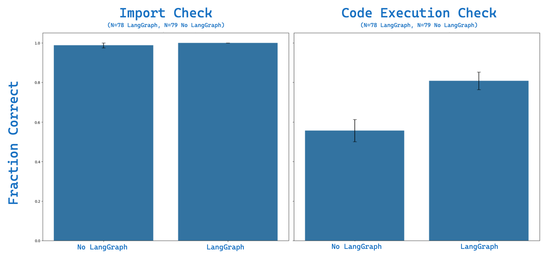 We then tested context stuffing + LangGraph to (1) perform checks for errors like this in both imports and code execution and (2) reflect on any errors when performing updated answer generation. On the same eval set, we see 100% of the import tests are correct along with ~81% of the code execution tests (N=78 trials).