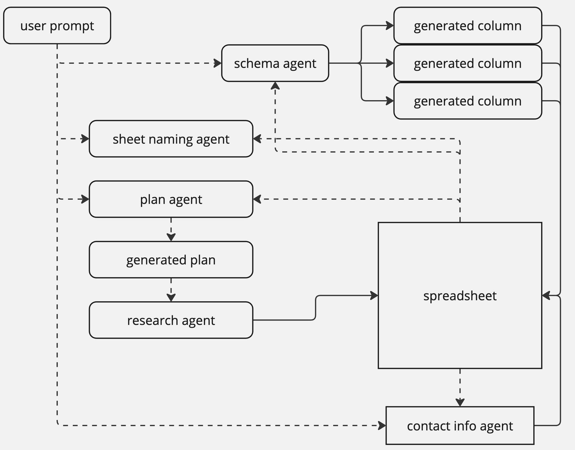 - Schema agent: Takes in a prompt as context and outputs a set of columns and column prompts that instruct our spreadsheet agents how to gather this data.