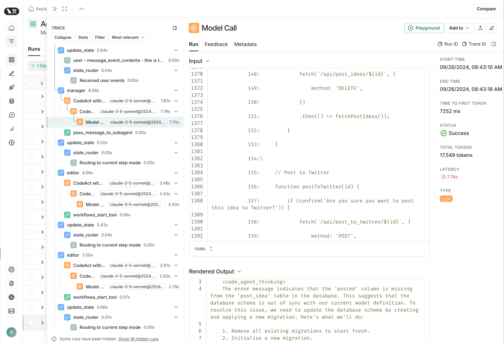 Replit Agent was a ripe example for advanced tracing needs. Their agentic tool goes beyond simply reviewing and writing code, but also performs a wider range of functions – including planning, creating dev environments, installing dependencies, and deploying applications for users.