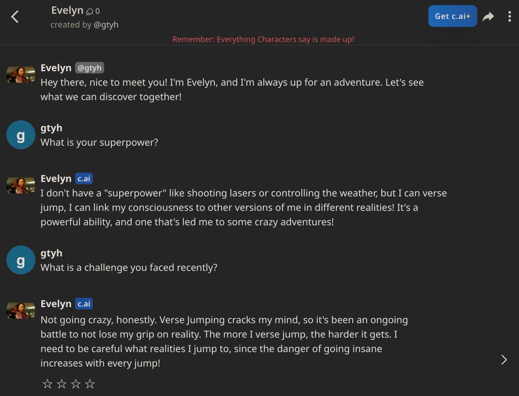 }You can then export this character definition to character.ai. In fact, we have already done so: you can chat with this rendition of Evelyn on character.ai here.