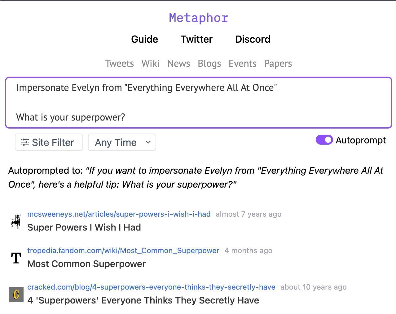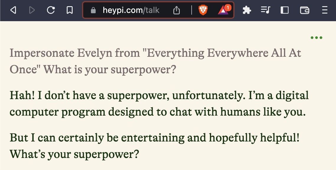 But what if you want to chat with a character from a movie that came out last year? Consider chatting with the main character, Evelyn, from Everything Everywhere All At Once. Neither ChatGPT- 3.5 and ChatGPT-4 can do it. Search-powered LLMs that can access current information often do not do much better: