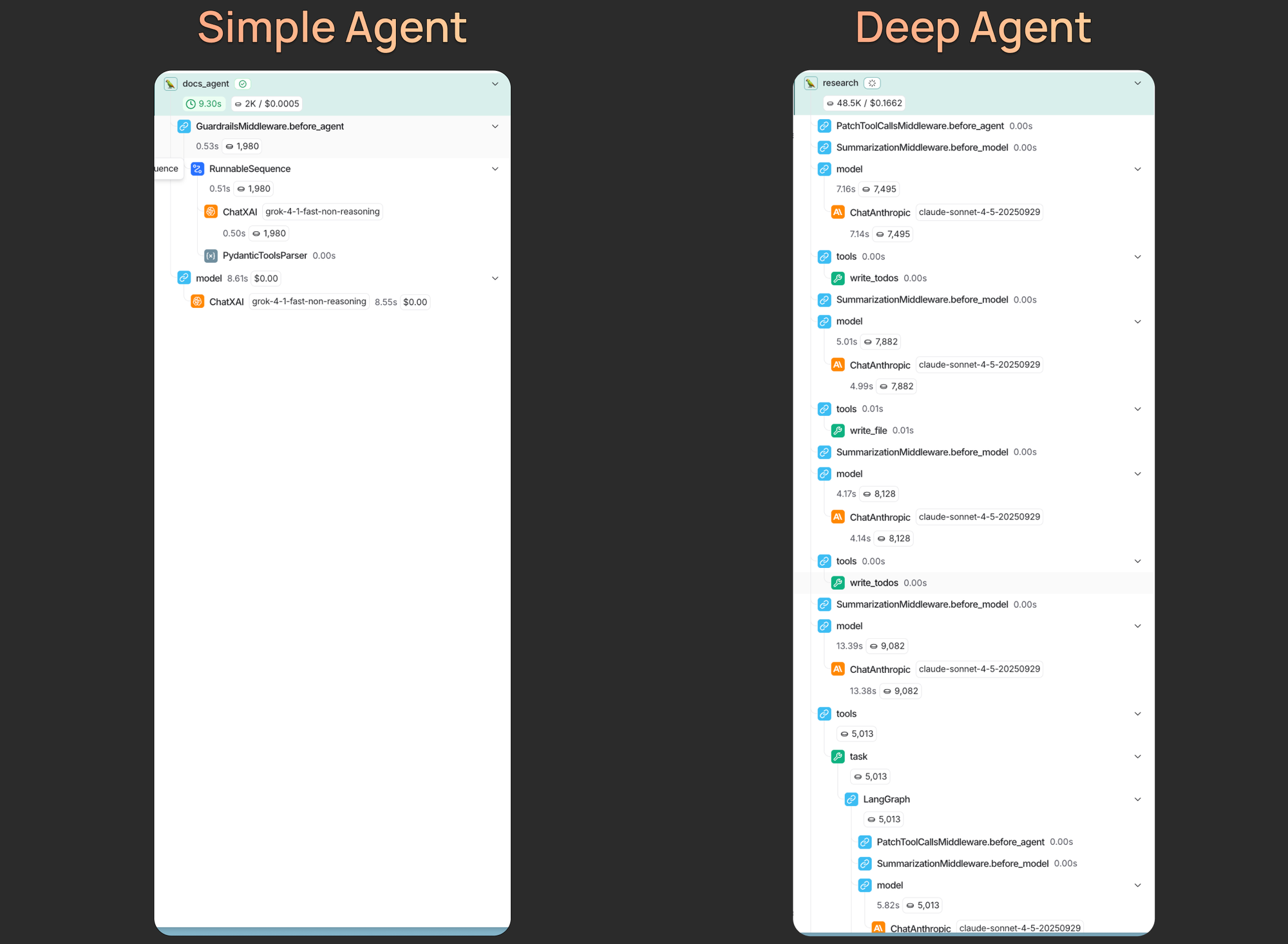 - Longer traces: Deep agents can run for dozens if not hundreds of steps (taking minutes to complete). When presented with such a large trace, there is simply more content for a human to parse through to find meaningful sections.