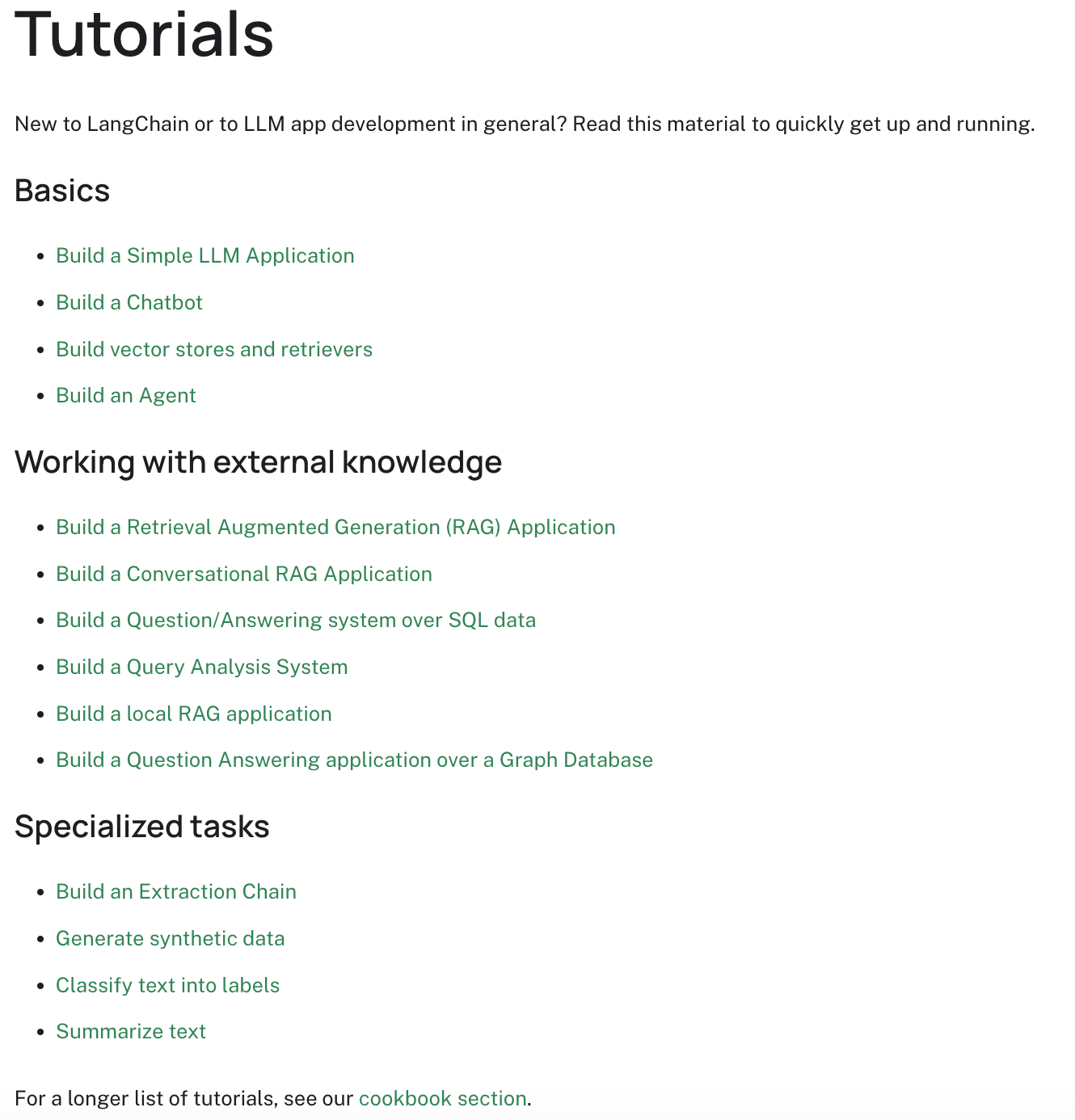 Tutorials are step-by-step guides for how to build specific applications from start to finish with LangChain, like a chatbot, RAG application, or agent. See the image below for an example of a tutorial.