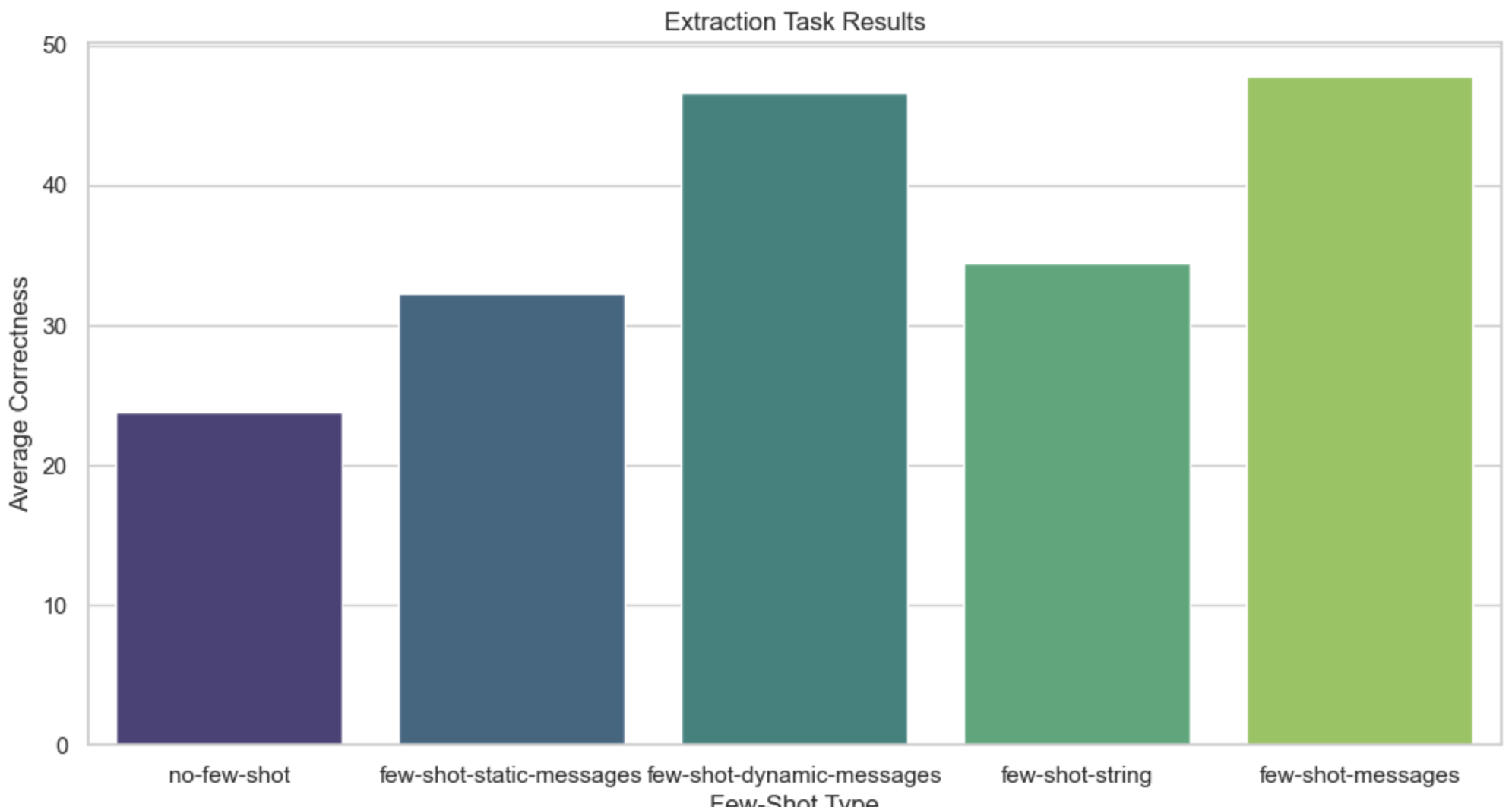 - few-shot-msgs, k=3: Three fixed examples were passed in as a list of messages between the system prompt and the human question.