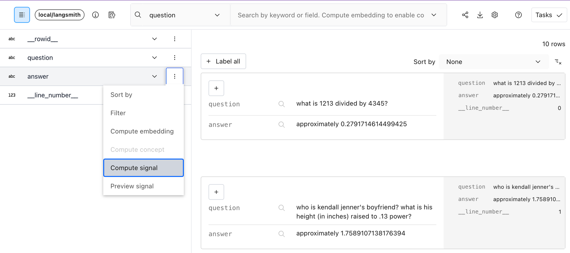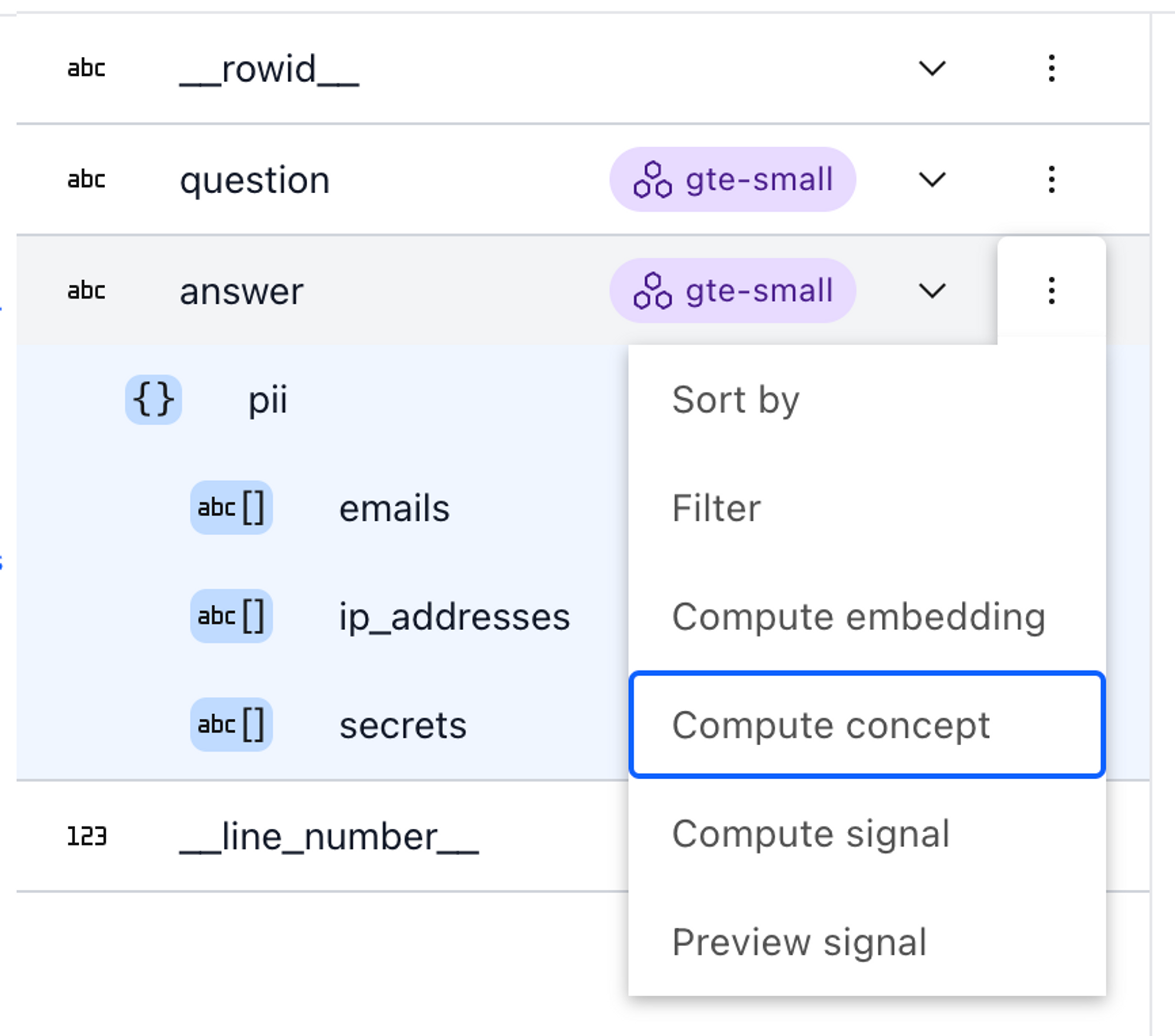 Right off the bat, Lilac provides two useful signals you can apply to your dataset: Near-duplicates and PII detection. Filtering near-duplicates for inputs is important to make sure the model gets diverse information and reduce changes of memorization. To compute a signal from the UI, expand the schema in the top left corner, and select “Compute Signal” from the context menu of the field you want to enrich.